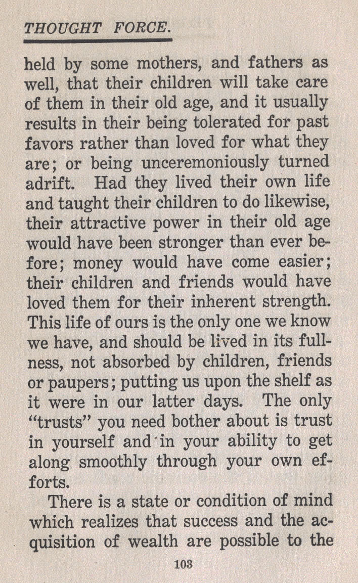 held by some mothers, and fathers as well, that their children will take care of them in their old age, and it usually results in their being tolerated for past favors rather than loved for what they are; or being unceremoniously turned adrift. Had they lived their own life and taught their children to do likewise, their attractive power in their old age would have been stronger than ever before;; money would have come easier; their children and friends would have loved them for their inherent strength. This life of ours is the only one we know we have, and should be lived in its fullness, not absorbed by children, friends or paupers; putting us upon the shelf as it were in our latter days. The only "trusts" you need bother about is trust in yourself and in your ability to get along smoothly through your own efforts.