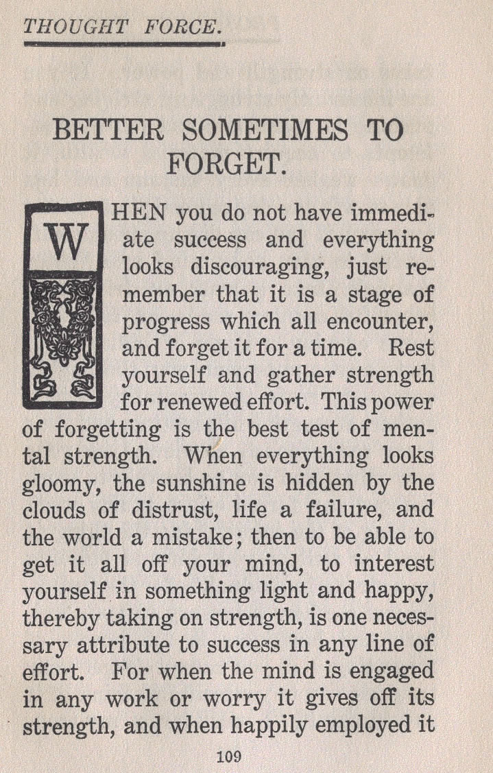 WHEN you do not have immediate success and everything looks discouraging, just remember that it is a stage of progress which all encounter, and forget it for a time. Rest yourself and gather strength for renewed effort. This power of forgetting is the best test of men- tal strength. When everything looks gloomy, the sunshine is hidden by the clouds of distrust, life a failure, and the world a mistake; then to be able to get it all off your mind, to interest yourself in something light and happy, thereby taking on strength, is one necessary attribute to success in any line of effort. For when the mind is engaged in any work or worry it gives off its strength, and when happily employed it