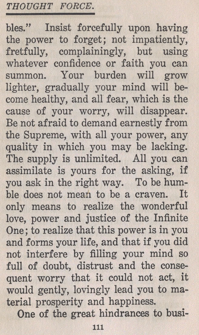 Insist forcefully upon having the power to forget; not impatiently, fretfully, complainingly, but using whatever confidence or faith you can summon. Your burden will grow lighter, gradually your mind will become healthy, and all fear, which is the cause of your worry, will disappear. Be not afraid to demand earnestly from the Supreme, with all your power, any quality in which you may be lacking. The supply is unlimited. All you can assimilate is yours for the asking, if you ask in the right way. To be humble does not mean to be a craven. It only means to realize the wonderful love, power and justice of the Infinite One; to realize that this power is in you and forms your life, and that if you did not interfere by filling your mind so full of doubt, distrust and the consequent worry that it could not act, it would gently, lovingly lead you to material prosperity and happiness.