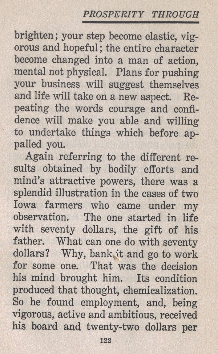 Again referring to the different results obtained by bodily efforts and mind's attractive powers, there was a splendid illustration in the cases of two Iowa farmers who came under my observation. The one started in life with seventy dollars, the gift of his father. What can one do with seventy dollars? Why, bank,it and go to work for some one. That was the decision his mind brought him. Its condition produced that thought, chemicalization. So he found employment, and, being vigorous, active and ambitious, received his board and twenty-two dollars per
