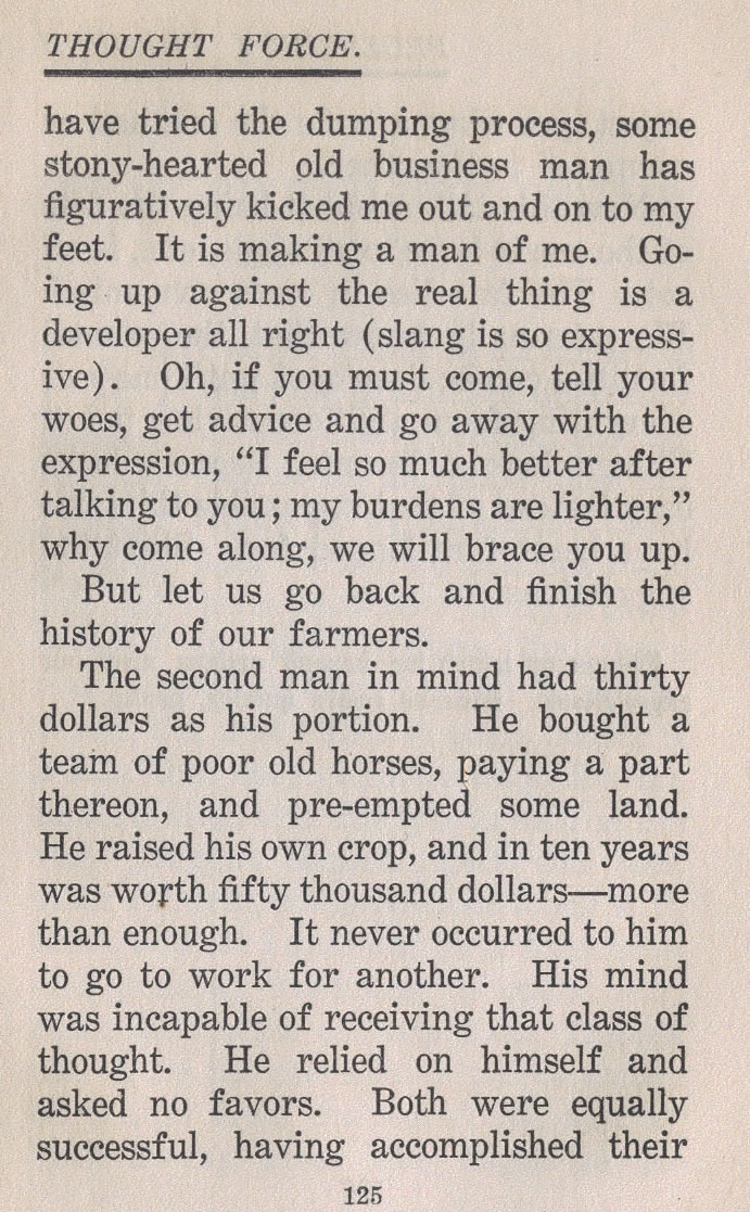 The second man in mind had thirty dollars as his portion. He bought a team of poor old horses, paying a part thereon, and pre-empted some land. He raised his own crop, and in ten years was worth fifty thousand dollars --- more than enough. It never occurred to him to go to work for another. His mind was incapable of receiving that class of thought. He relied on himself and asked no favors. Both were equally successful, having accomplished their