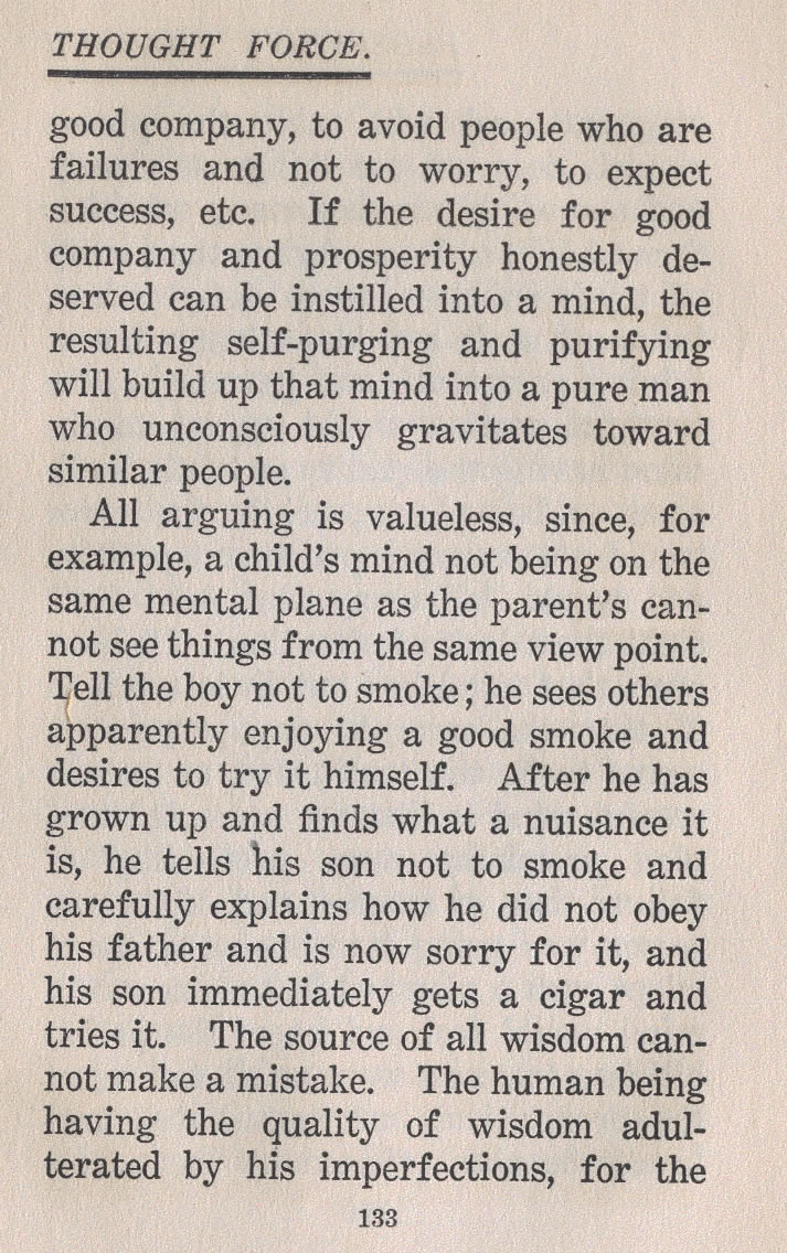 All arguing is valueless, since, for example, a child's mind not being on the same mental plane as the parent's cannot see things from the same view point. Tell the boy not to smoke he sees others apparently enjoying a good smoke and desires to try it himself. After he has grown up and finds what a nuisance it is, he tells his son not to smoke and carefully explains how he did not obey his father and is now sorry for it, and his son immediately gets a cigar and tries it. The source of all wisdom cannot make a mistake. The human being having the quality of wisdom adulterated by his imperfections, for the