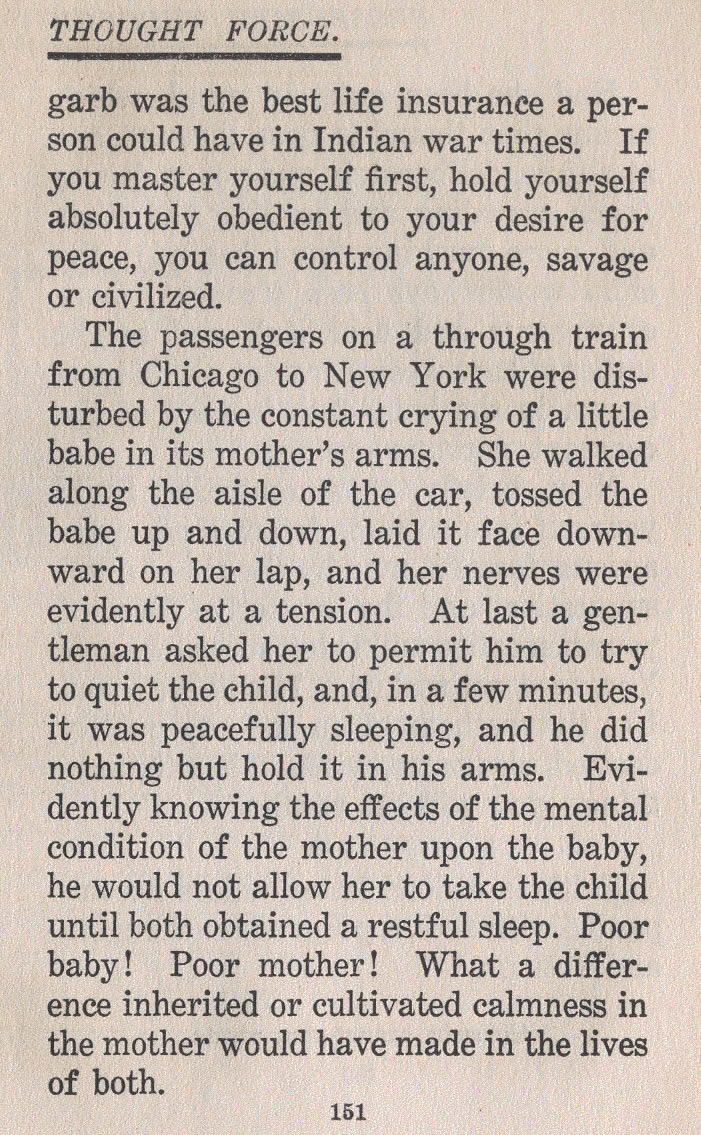 The passengers on a through train from Chicago to New York were disturbed by the constant crying of a little babe in its mother's arms. She walked along the aisle of the car, tossed the babe up and down, laid it face downward on her lap, and her nerves were evidently at a tension. At last a gentleman asked her to permit him to try to quiet the child, and, in a few minutes, it was peacefully sleeping, and he did nothing but hold it in his arms. Evidently knowing the effects of the mental condition of the mother upon the baby, he would not allow her to take the child until both obtained a restful sleep. Poor baby! Poor mother! What a difference inherited or cultivated calmness in the mother would have made in the lives of both.