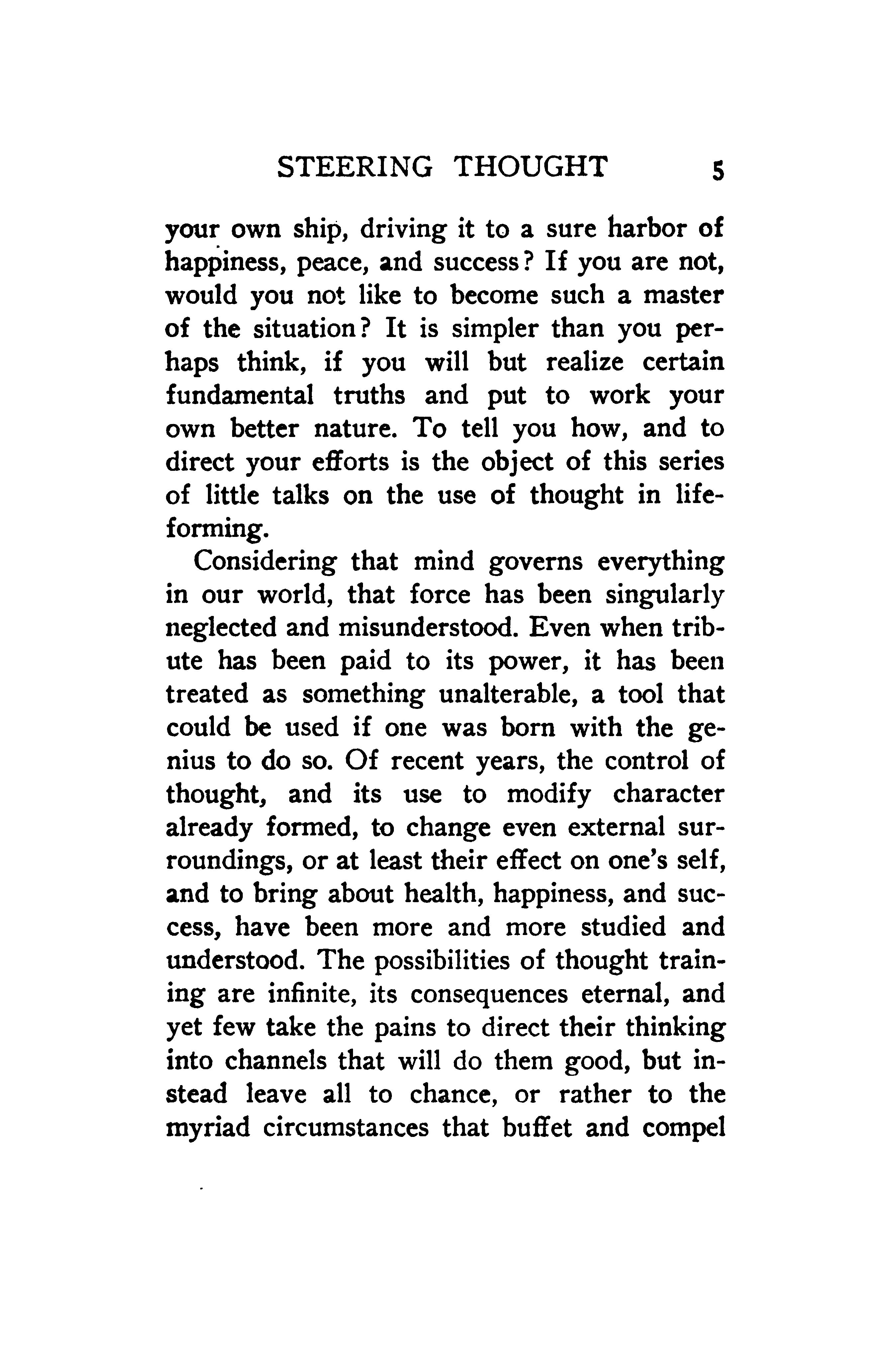 your own ship, driving it to a sure harbor of happiness, peace, and success? If you are not, would you not like to become such a master of the situation? It is simpler than you perhaps think, if you will but realize certain fundamental truths and put to work your own better nature. To tell you how, and to direct your efforts is the object of this series of little talks on the use of thought in life-forming.
