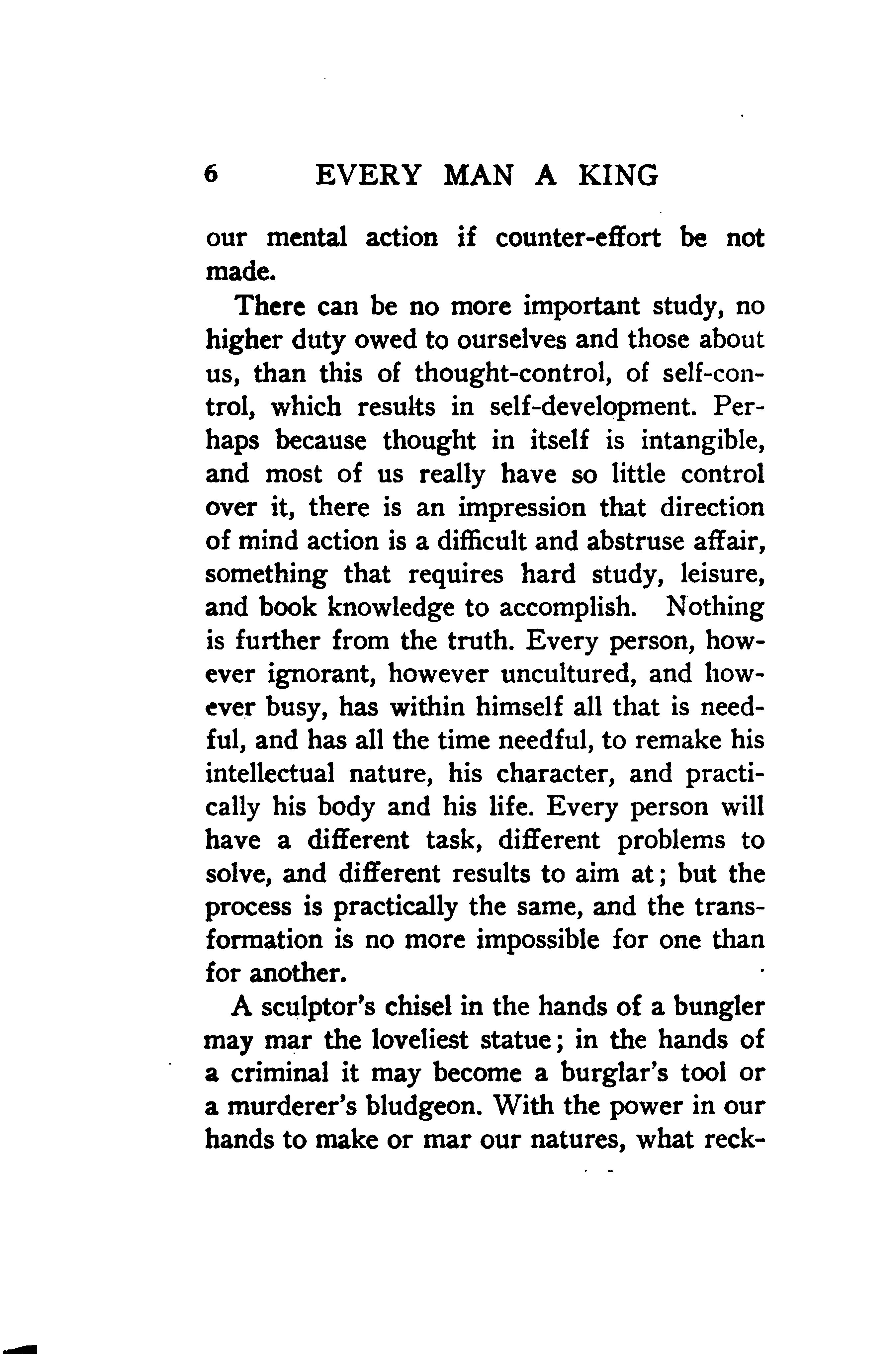 There can be no more important study, no higher duty owed to ourselves and those about us, than this of thought-control, of self-control, which results in self-development. Perhaps because thought in itself is intangible, and most of us really have so little control over it, there is an impression that direction of mind action is a difficult and abstruse affair, something that requires hard study, leisure, and book knowledge to accomplish. Nothing is further from the truth. Every person, however ignorant, however uncultured, and however busy, has within himself all that is needful, and has all the time needful, to remake his intellectual nature, his character, and practically his body and his life. Every person will have a different task, different problems to solve, and different results to aim at; but the process is practically the same, and the transformation is no more impossible for one than for another.