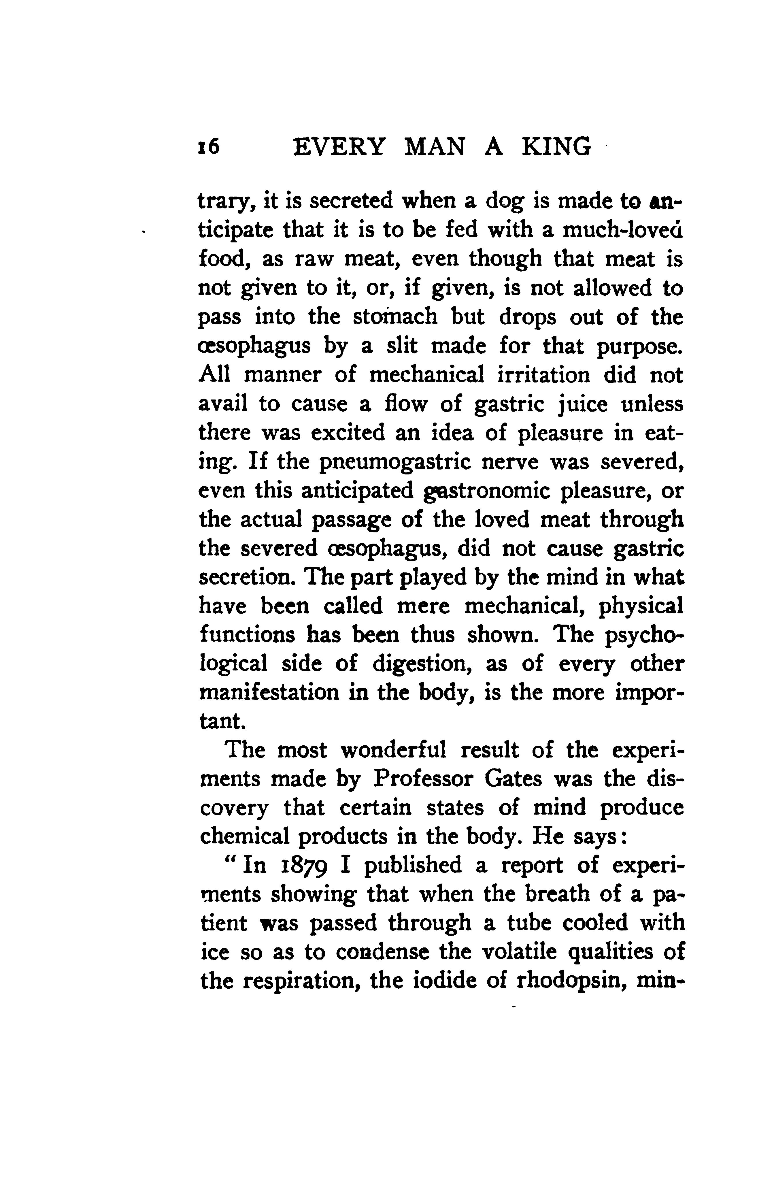 All manner of mechanical irritation did not avail to cause a flow of gastric juice unless there was excited an idea of pleasure in eating. If the pneumogastric nerve was severed, even this anticipated gastronomic pleasure, or the actual passage of the loved meat through the severed esophagus, did not cause gastric secretion. The part played by the mind in what have been called mere mechanical, physical functions has been thus shown. The psychological side of digestion, as of every other manifestation in the body, is the more important.