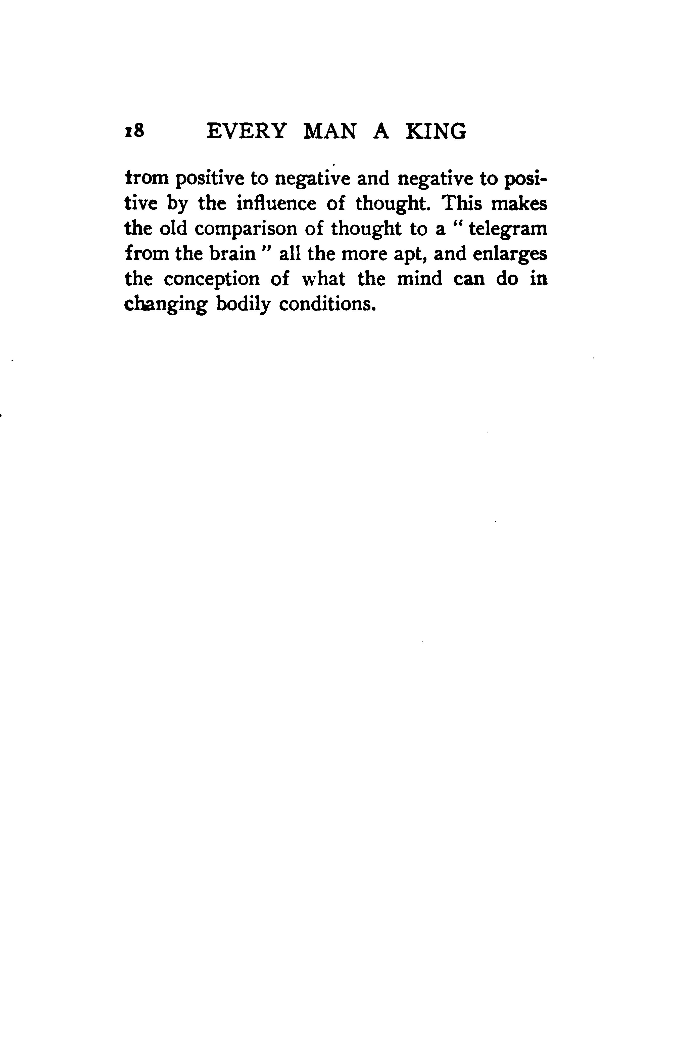 from positive to negative and negative to positive by the influence of thought. This makes the old comparison of thought to a “telegram from the brain” all the more apt, and enlarges the conception of what the mind can do in changing bodily conditions.