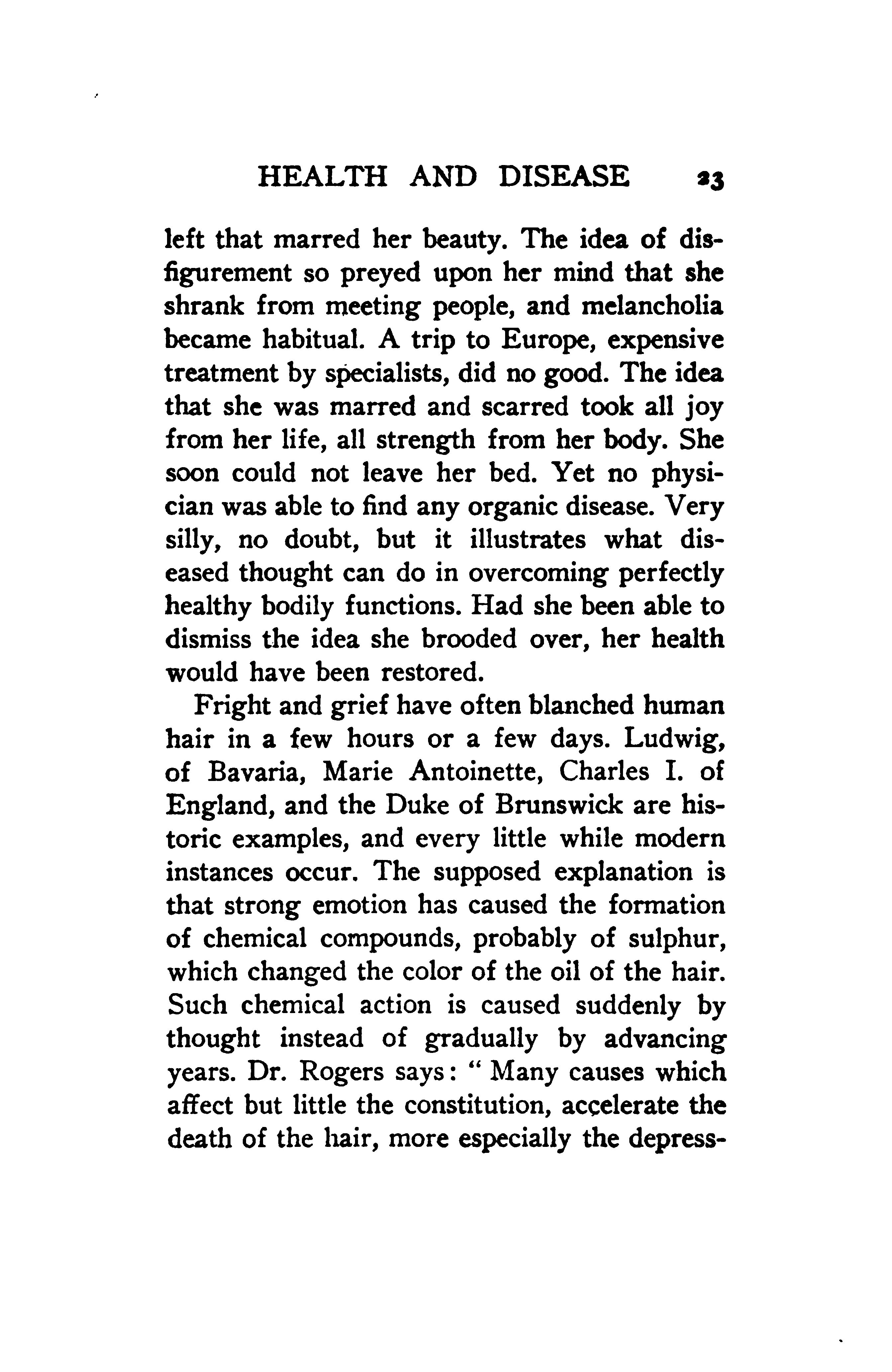 Fright and grief have often blanched human hair in a few hours or a few days. Ludwig, of Bavaria, Marie Antoinette, Charles I of England, and the Duke of Brunswick are historic examples, and every little while modern instances occur. The supposed explanation is that strong emotion has caused the formation of chemical compounds, probably of sulphur, which changed the color of the oil of the hair. Such chemical action is caused suddenly by thought instead of gradually by advancing years. Dr. Rogers says: “Many causes which affect but little the constitution, accelerate the death of the hair, more especially the depressing