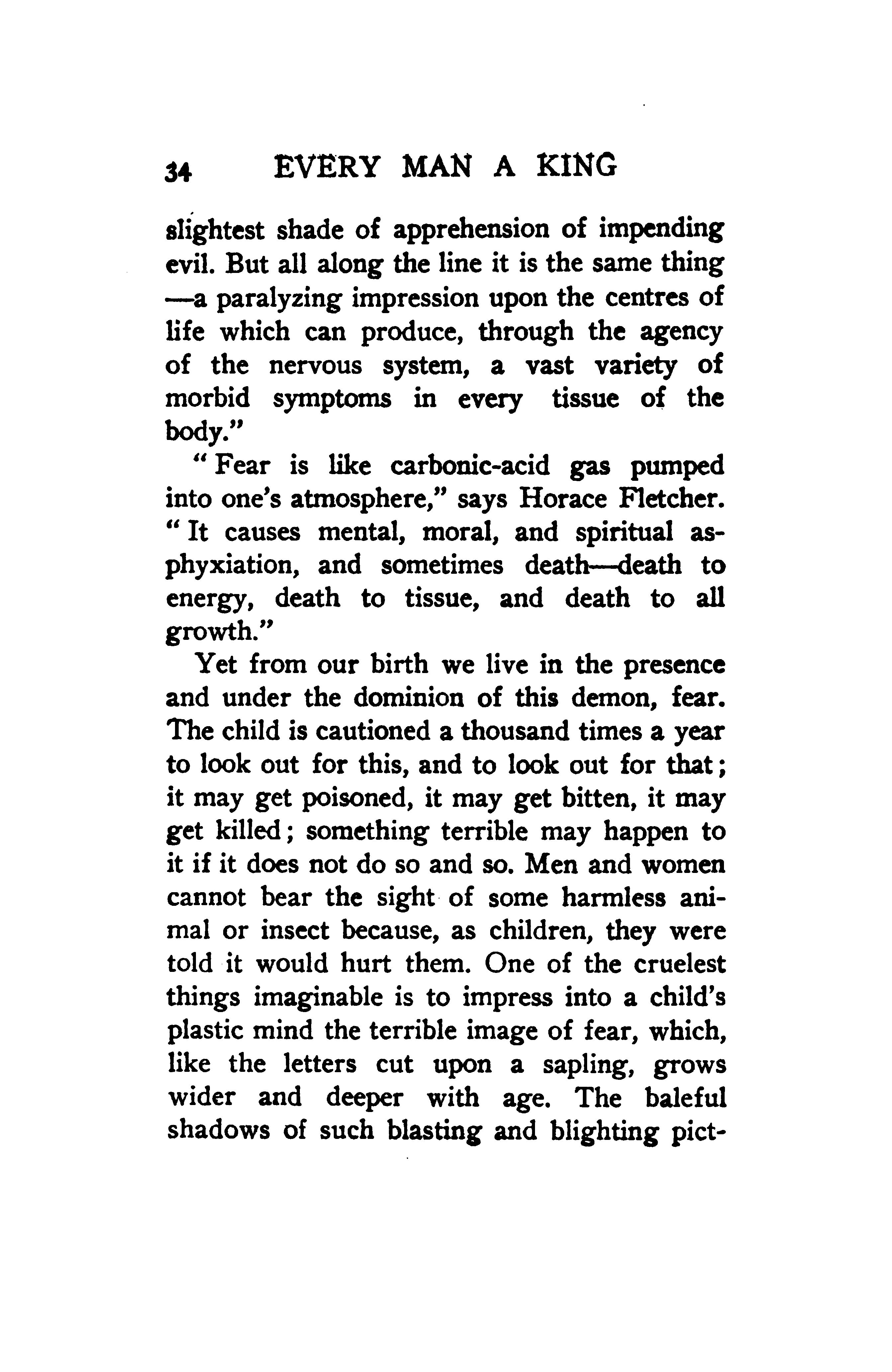 “Fear is like carbonic-acid gas pumped into one’s atmosphere,” says Horace Fletcher. “It causes mental. moral, and spiritual asphyxiation, and sometimes death --- death to energy, death to tissue, and death to all growth.”