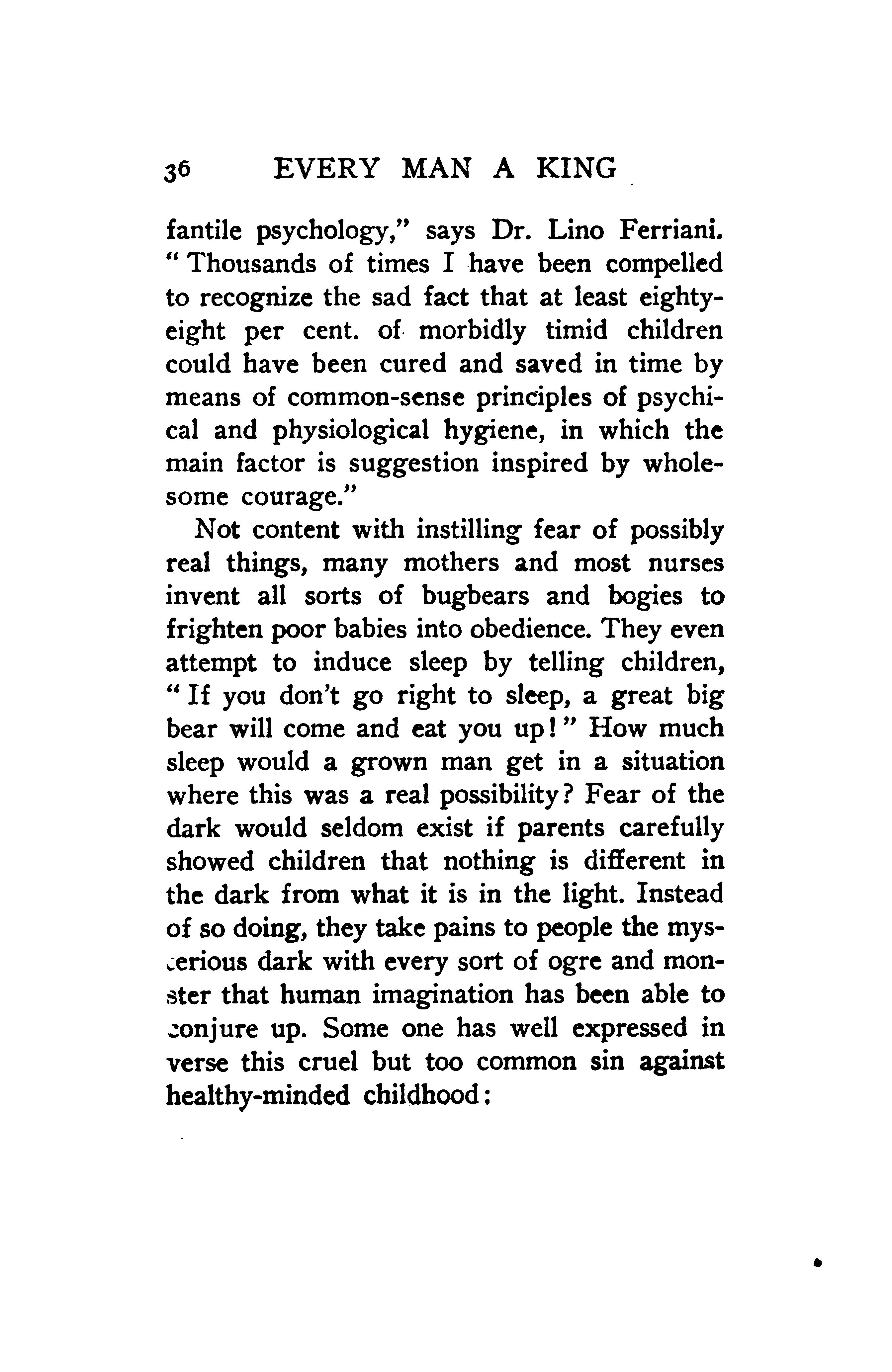 psychology,” says Dr. Lino Ferriani. “Thousands of times I have been compelled to recognize the sad fact that at least eighty-eight per cent of morbidly timid children could have been cured and saved in time by means of common-sense principles of psychical and physiological hygiene, in which the main factor is suggestion inspired by wholesome courage.”