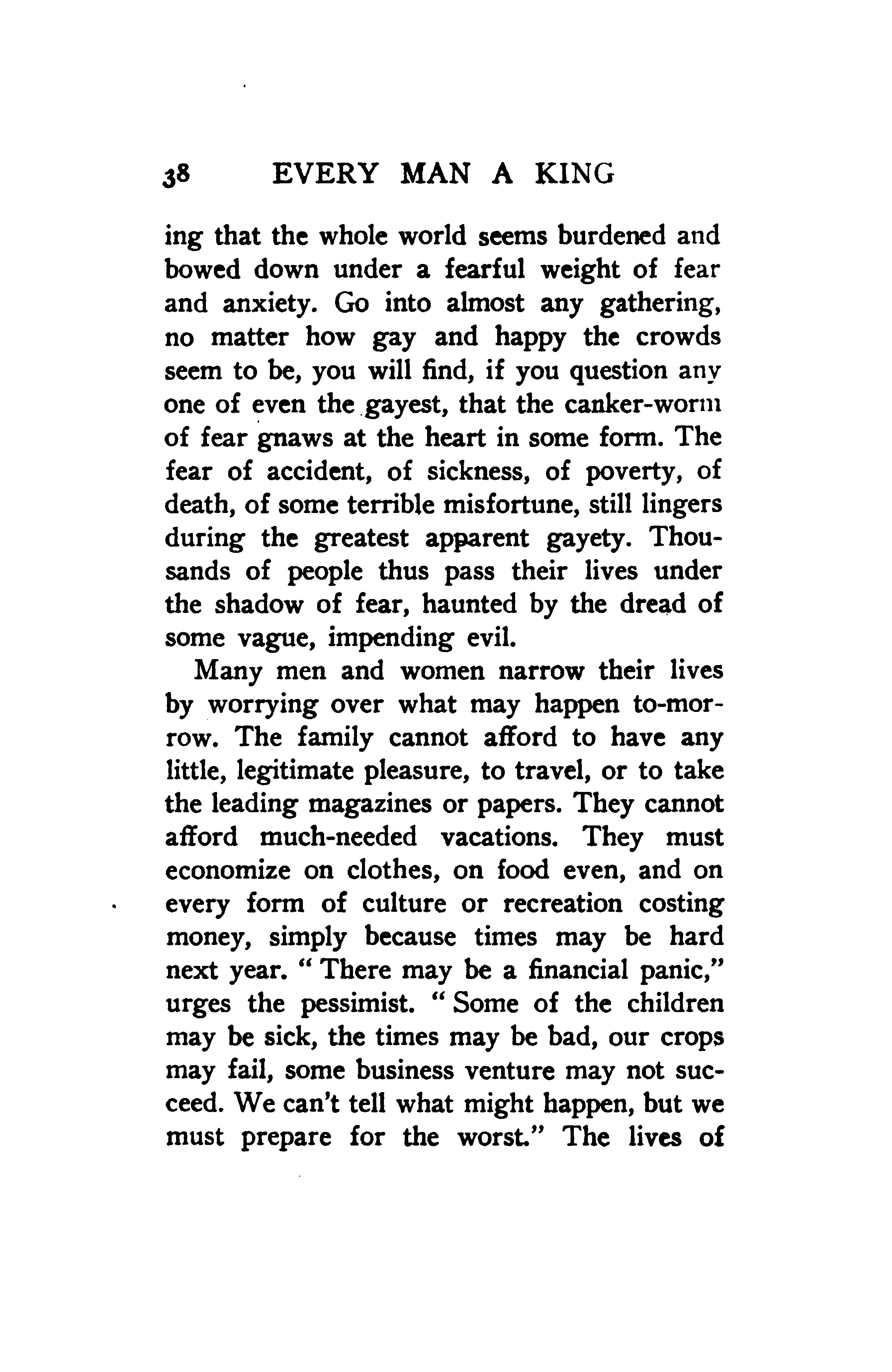 Many men and women narrow their lives by worrying over what may happen tomorrow. The family cannot afford to have any little, legitimate pleasure, to travel, or to take the leading magazines or papers. They cannot afford much-needed vacations. They must economize on clothes, on food even, and on every form of culture or recreation costing money, simply because times may be hard next year. “There may be a financial panic,” urges the pessimist. “Some of the children may be sick, the times may be bad, our crops may fail, some business venture may not succeed. We can’t tell what might happen, but we must prepare for the worst.” The lives of