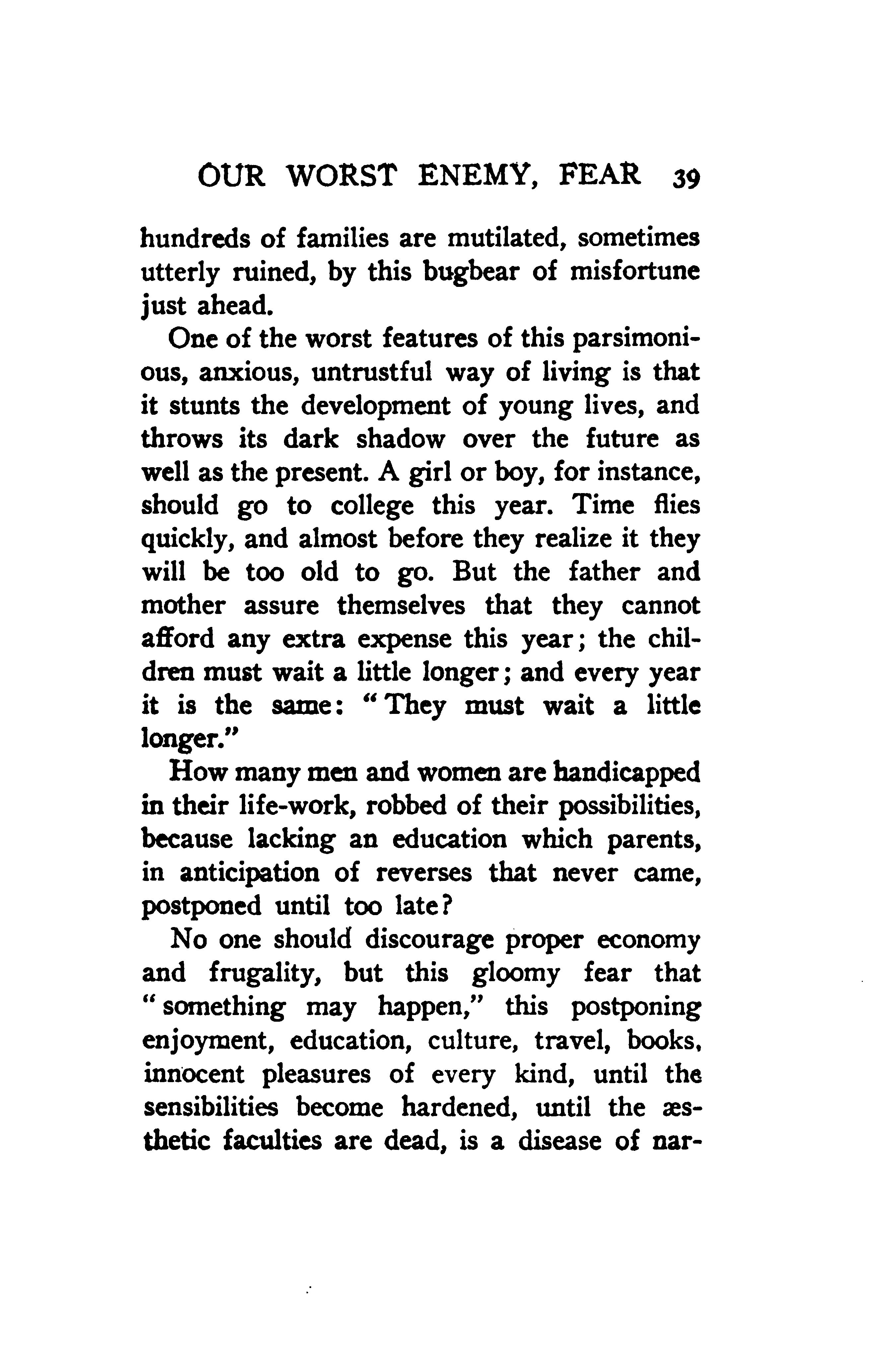 No one should discourage proper economy and frugality, but this gloomy fear that “something may happen,” this postponing enjoyment, education, culture, travel, books, innocent pleasures of every kind, until the sensibilities become hardened, until the esthetic faculties are dead, is a disease of narrow,