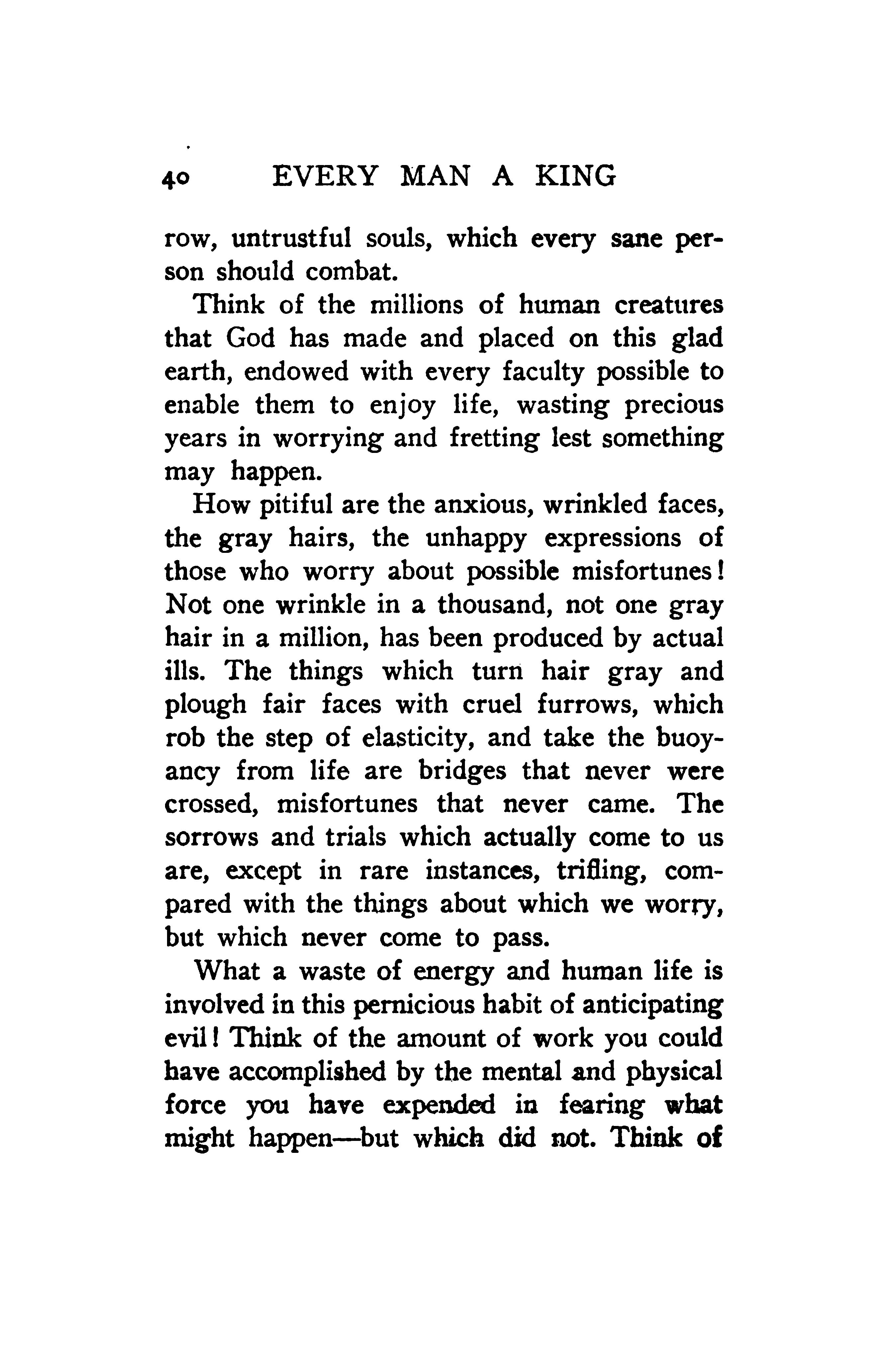 Think of the millions of human creatures that God has made and placed on this glad earth, endowed with every faculty possible to enable them to enjoy life, wasting precious years in worrying and fretting lest something may happen.