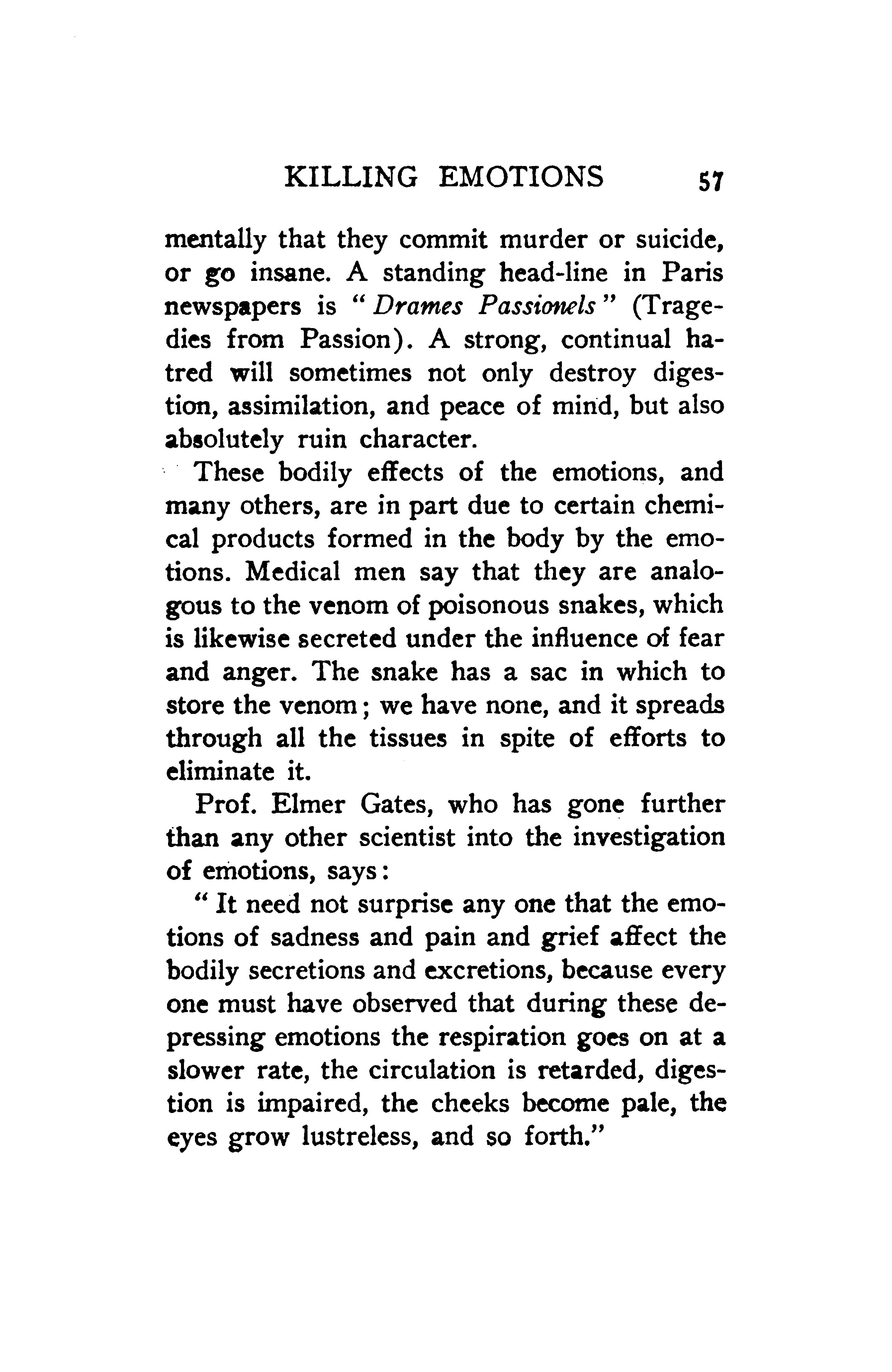 These bodily effects of the emotions, and many others, are in part due to certain chemical products formed in the body by the emotions. Medical men say that they are analogous to the venom of poisonous snakes, which is likewise secreted under the influence of fear and anger. The snake has a sac in which to store the venom; we have none, and it spreads through all the tissues in spite of efforts to eliminate it.