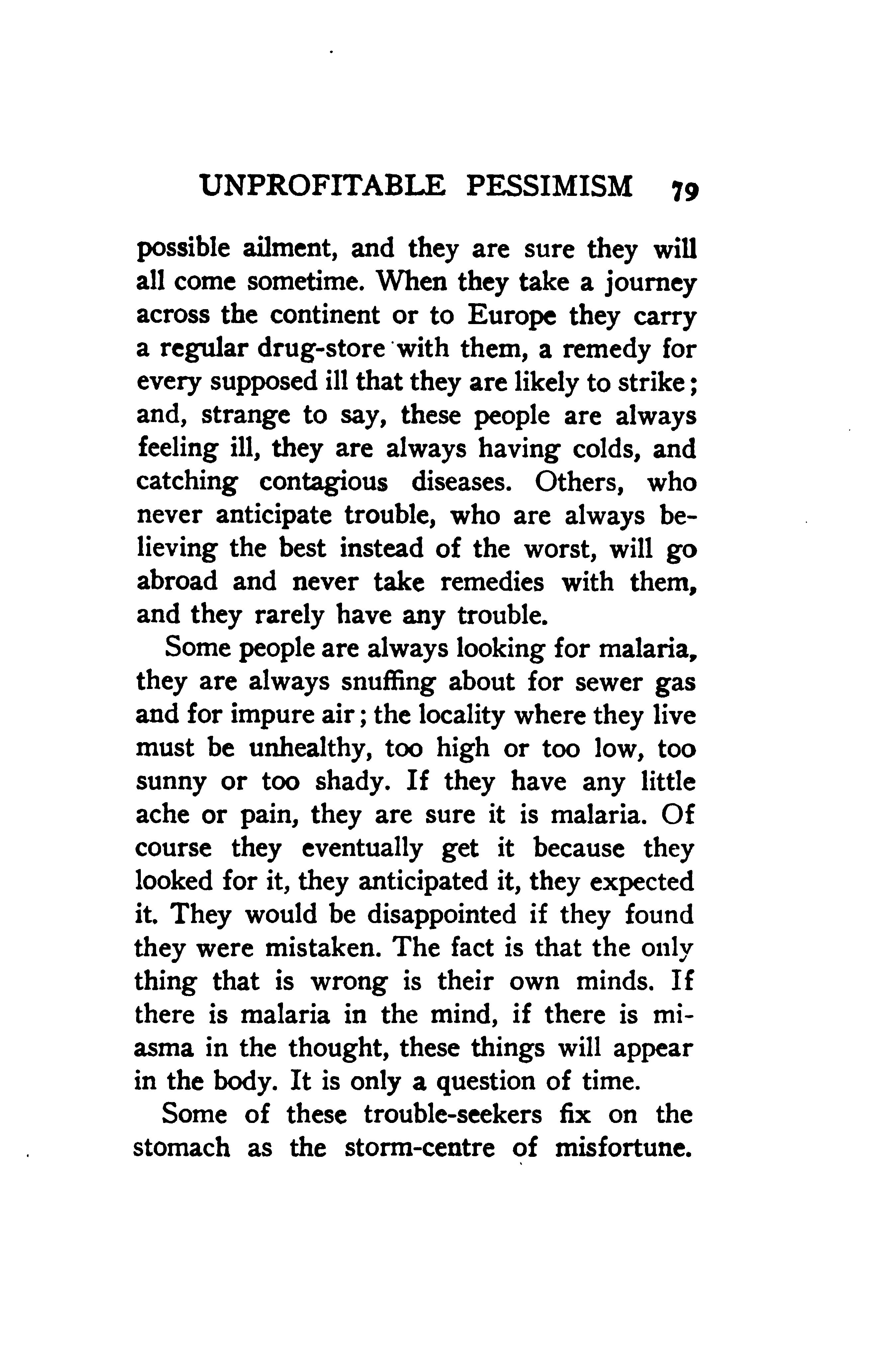 Some people are always looking for malaria, they are always snuffing about for sewer gas and for impure air; the locality where they live must be unhealthy, too high or too low, too sunny or too shady. If they have any little ache or pain, they are sure it is malaria. Of course they eventually get it because they looked for it, they anticipated it, they expected it. They would be disappointed if they found they were mistaken. The fact is that the only thing that is wrong is their own minds. If there is malaria in the mind, if there is miasma in the thought, these things will appear in the body. It is only a question of time.