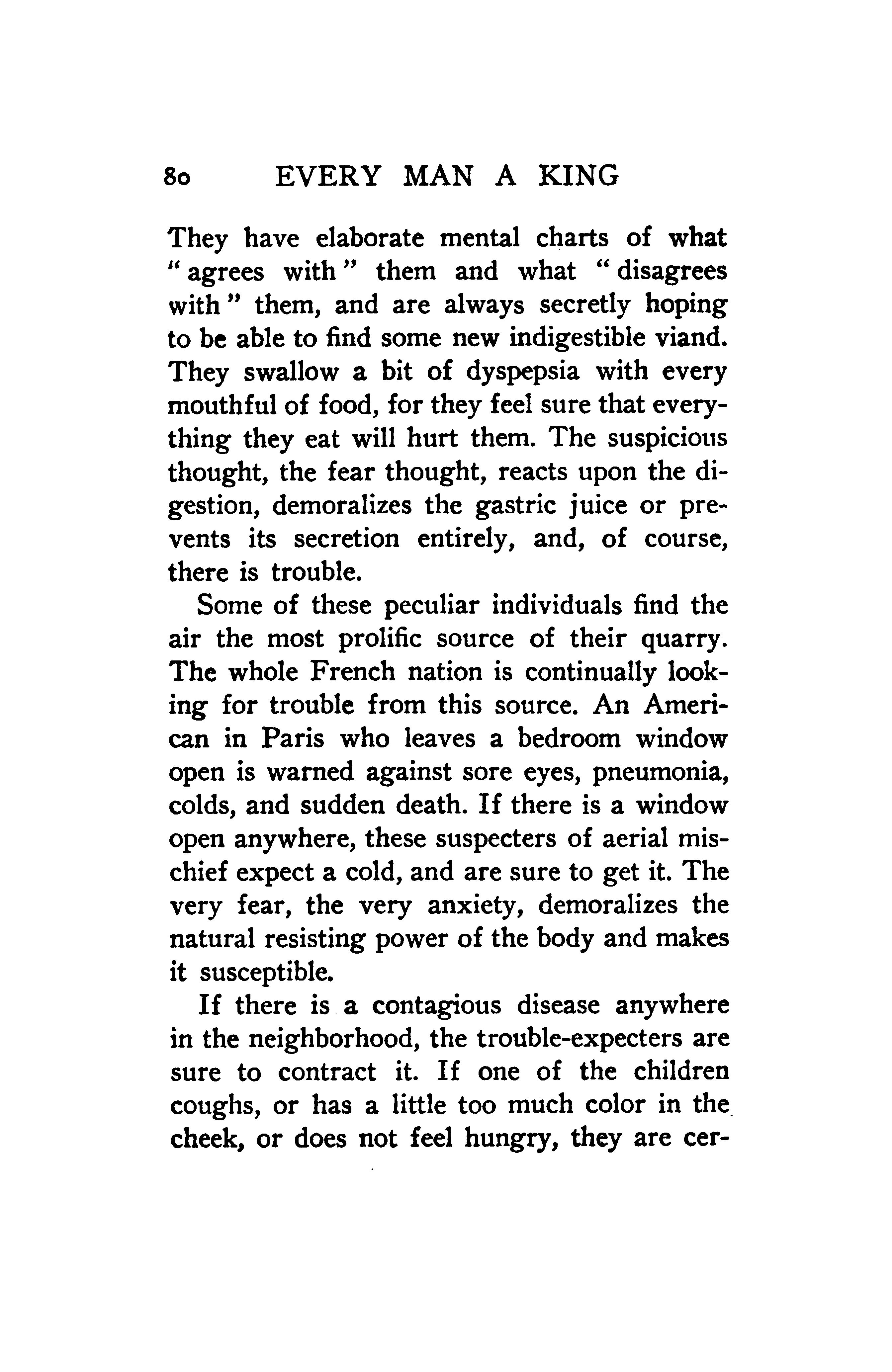 Some of these peculiar individuals find the air the most prolific source of their quarry. The whole French nation is continually looking for trouble from this source. An American in Paris who leaves a bedroom window open is warned against sore eyes, pneumonia, colds, and sudden death. If there is a window open anywhere, these suspecters of aerial mischief expect a cold, and are sure to get it. The very fear, the very anxiety, demoralizes the natural resisting power of the body and makes it susceptible.