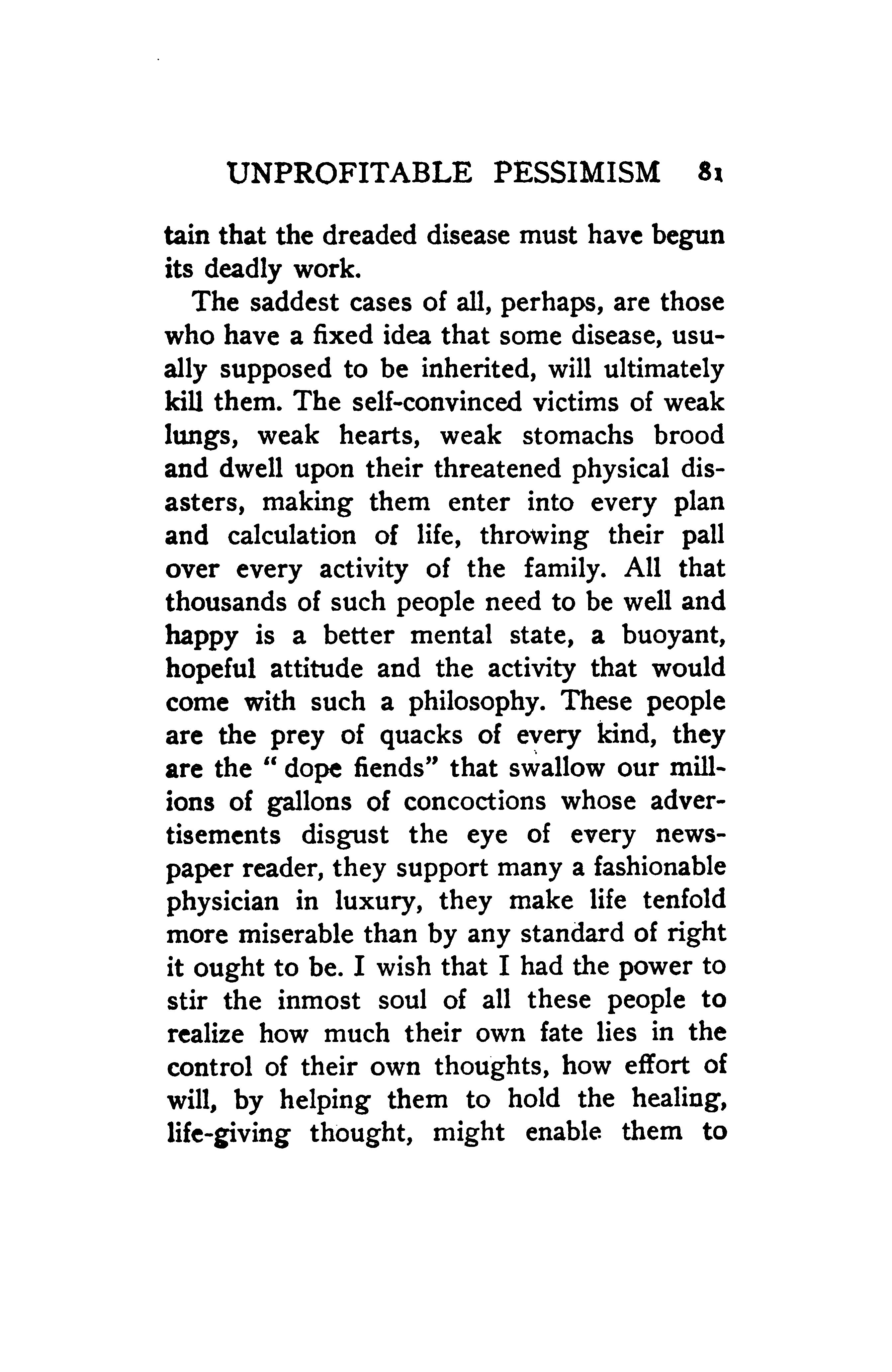 The saddest cases of all, perhaps, are those who have a fixed idea that some disease, usually supposed to be inherited, will ultimately kill them. The self-convinced victims of weak lungs, weak hearts, weak stomachs brood and dwell upon their threatened physical disasters, making them enter into every plan and calculation of life, throwing their pall over every activity of the family. All that thousands of such people need to be well and happy is a better mental state, a buoyant, hopeful attitude and the activity that would come with such a philosophy. These people are the prey of quacks of every kind, they are the “dope fiends” that swallow our millions of gallons of concoctions whose advertisements disgust the eye of every newspaper reader, they support many a fashionable physician in luxury, they make life tenfold more miserable than by any standard of right it ought to be. I wish that I had the power to stir the inmost soul of all these people to realize how much their own fate lies in the control of their own thoughts, how effort of will, by helping them to hold the healing, life-giving thought, might enable them to