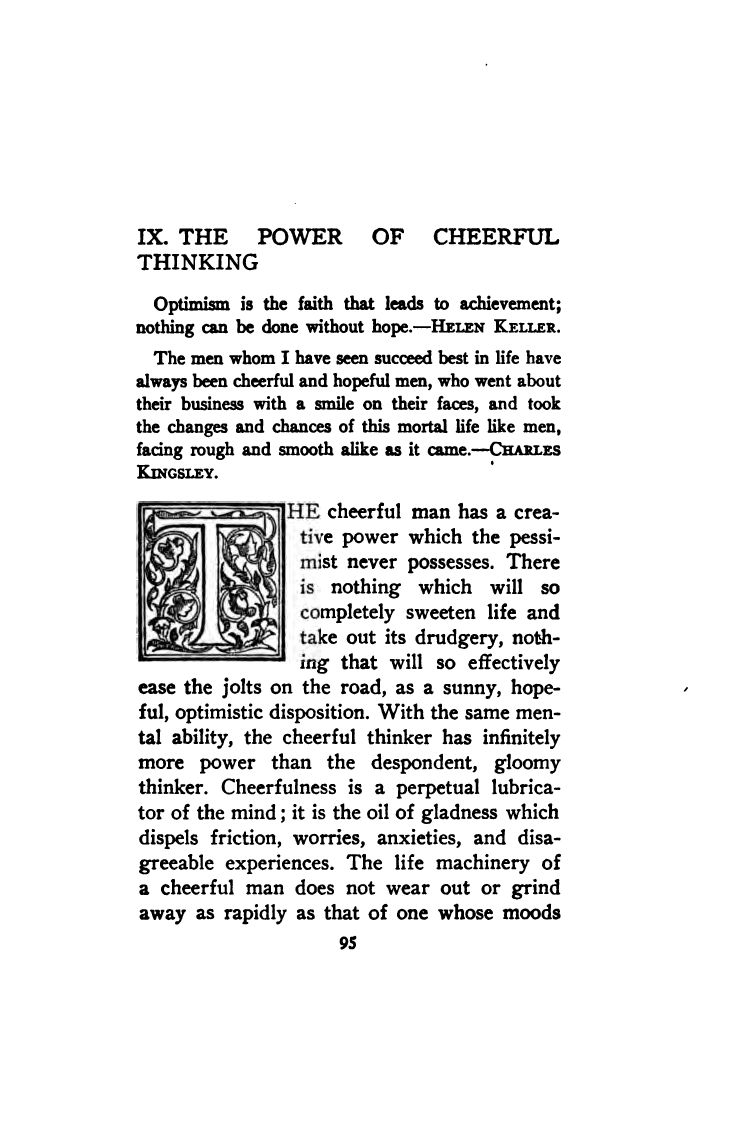 Steering Thought Prevents Life Wrecks - How Mind Rules the Body - Thought Causes Health and Disease - Our Worst Enemy is Fear - Overcoming Fear - Killing Emotions - Mastering Our Moods - Unprofitable Pessimism - Power of Cheerful Thinking - Negative Creeds Paralyze - Affirmation Creates Power - Thoughts Radiate As Influence - How Thinking Brings Success - Power of Self-Faith Over Others - Building Character - Strengthening Deficient Faculties - Gain Beauty by Holding the Beauty Thought - Power of Imagination - Don't Let the Years Count - How to Control Thought - The Coming Man Will Realize His Divinity - Contents -