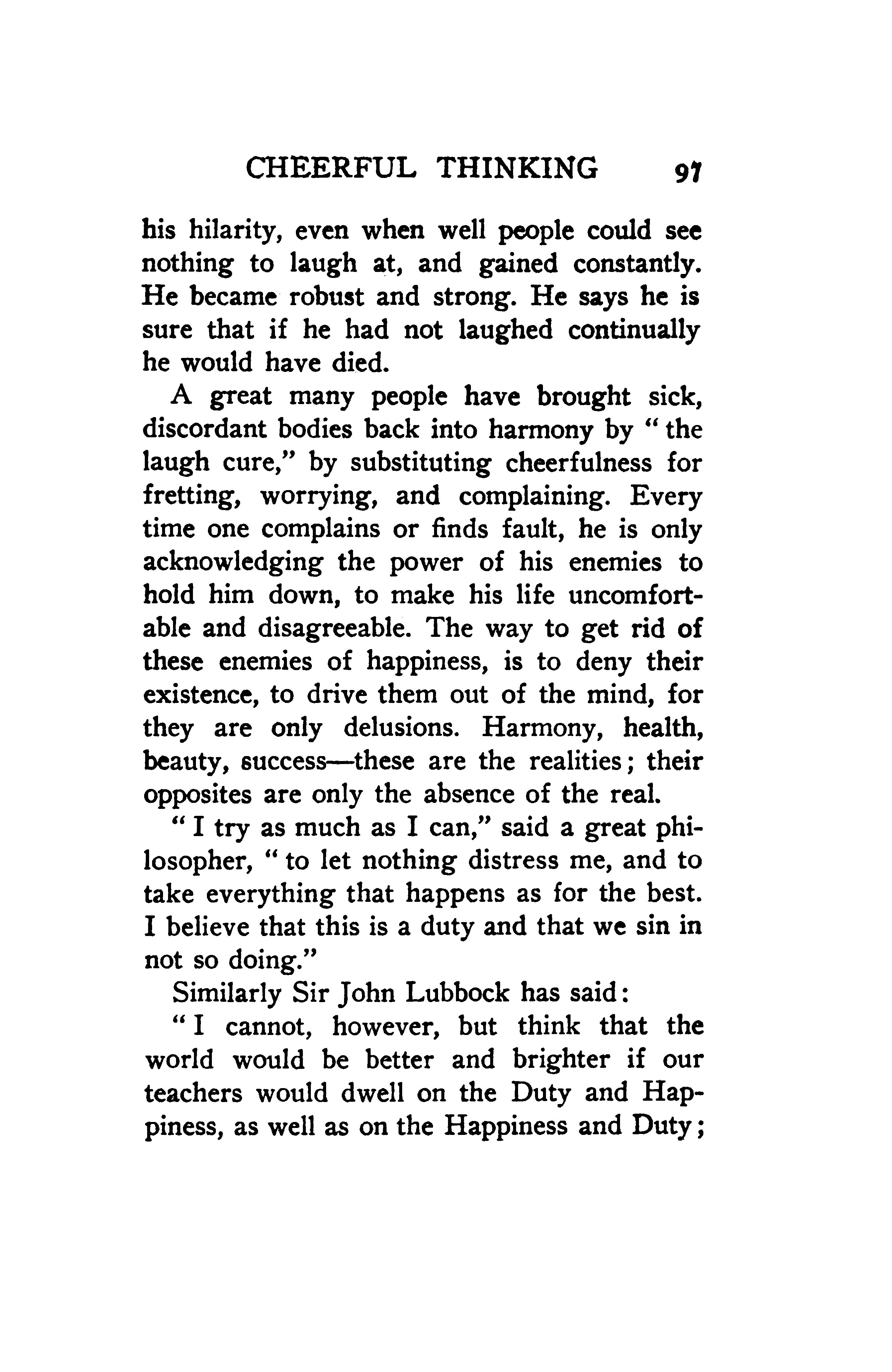 A great many people have brought sick, discordant bodies back into harmony by “the laugh cure”, by substituting cheerfulness for fretting, worrying, and complaining. Every time one complains or finds fault, he is only acknowledging the power of his enemies to hold him down, to make his life uncomfortable and disagreeable. The way to get rid of these enemies of happiness, is to deny their existence, to drive them out of the mind, for they are only delusions. Harmony, health, beauty, success --- these are the realities; their opposites are only the absence of the real.