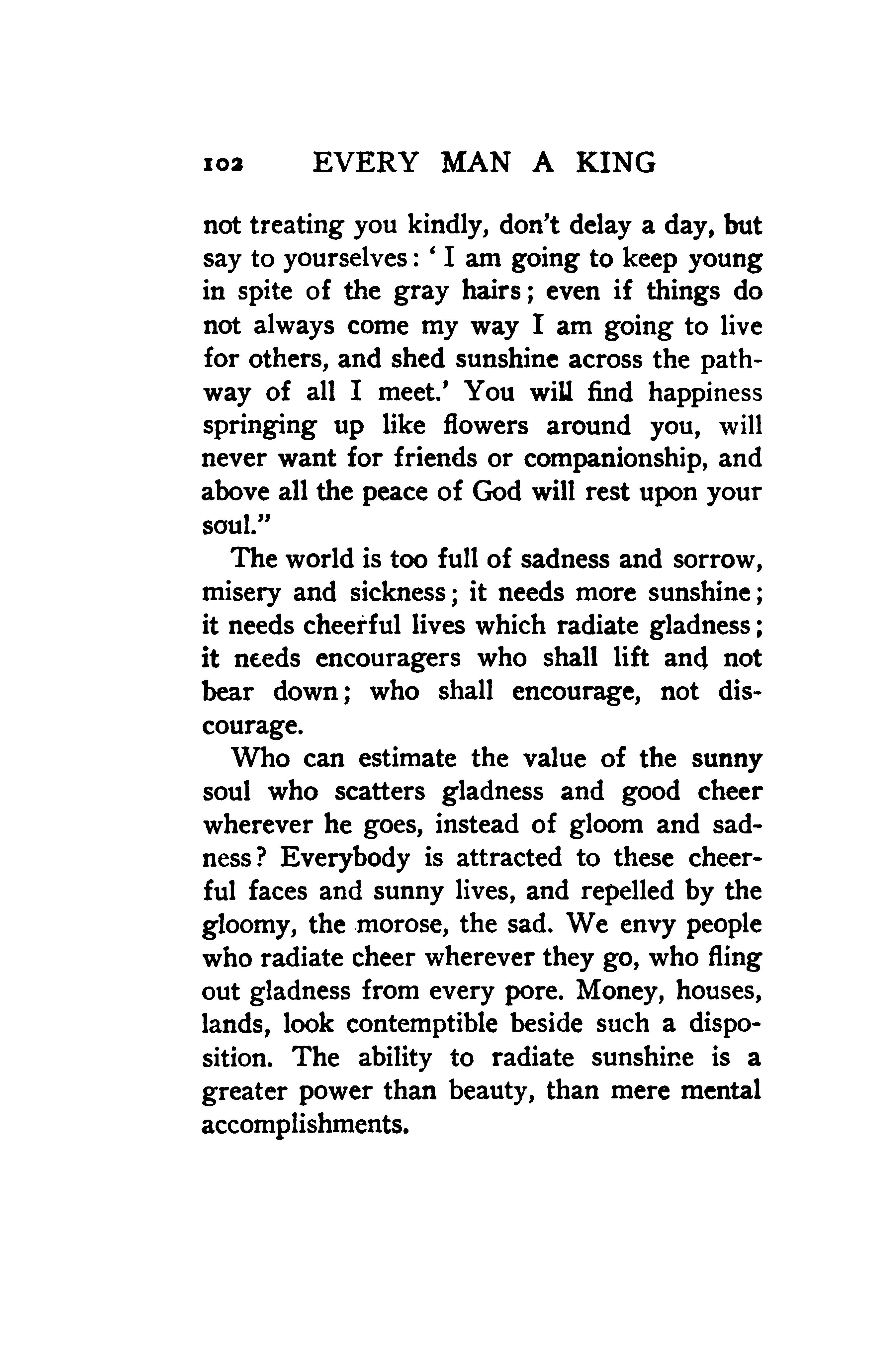 Who can estimate the value of the sunny soul who scatters gladness and good cheer wherever he goes, instead of gloom and sadness? Everybody is attracted to these cheerful faces and sunny lives, and repelled by the gloomy, the morose, the sad. We envy people who radiate cheer wherever they go, who fling out gladness from every pore. Money, houses, lands, look contemptible beside such a disposition. The ability to radiate sunshine is a greater power than beauty, than mere mental accomplishments.