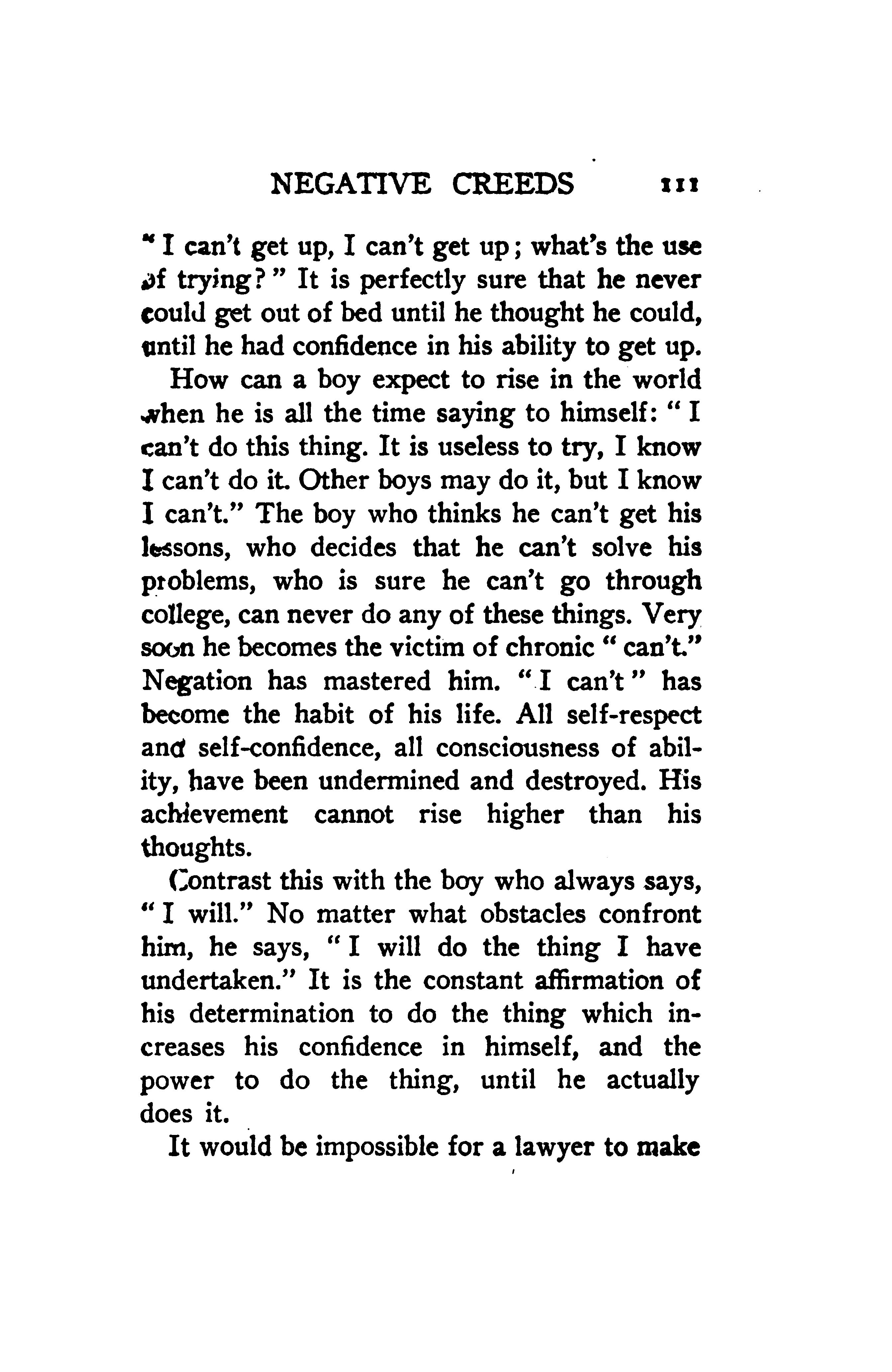 How can a boy expect to rise in the world when he is all the time saying to himself: “I can’t do this thing. It is useless to try, I know I can’t do it. Other boys may do it, but I know I can’t.” The boy who thinks he can’t get his lessons, who decides that he can’t solve his problems, who is sure he can’t go through college, can never do any of these things. Very soon he becomes the victim of chronic “can’t”. Negation has mastered him. “I can’t” has become the habit of his life. All self-respect and self-confidence, all consciousness of ability, have been undermined and destroyed. His achievement cannot rise higher than his thoughts.