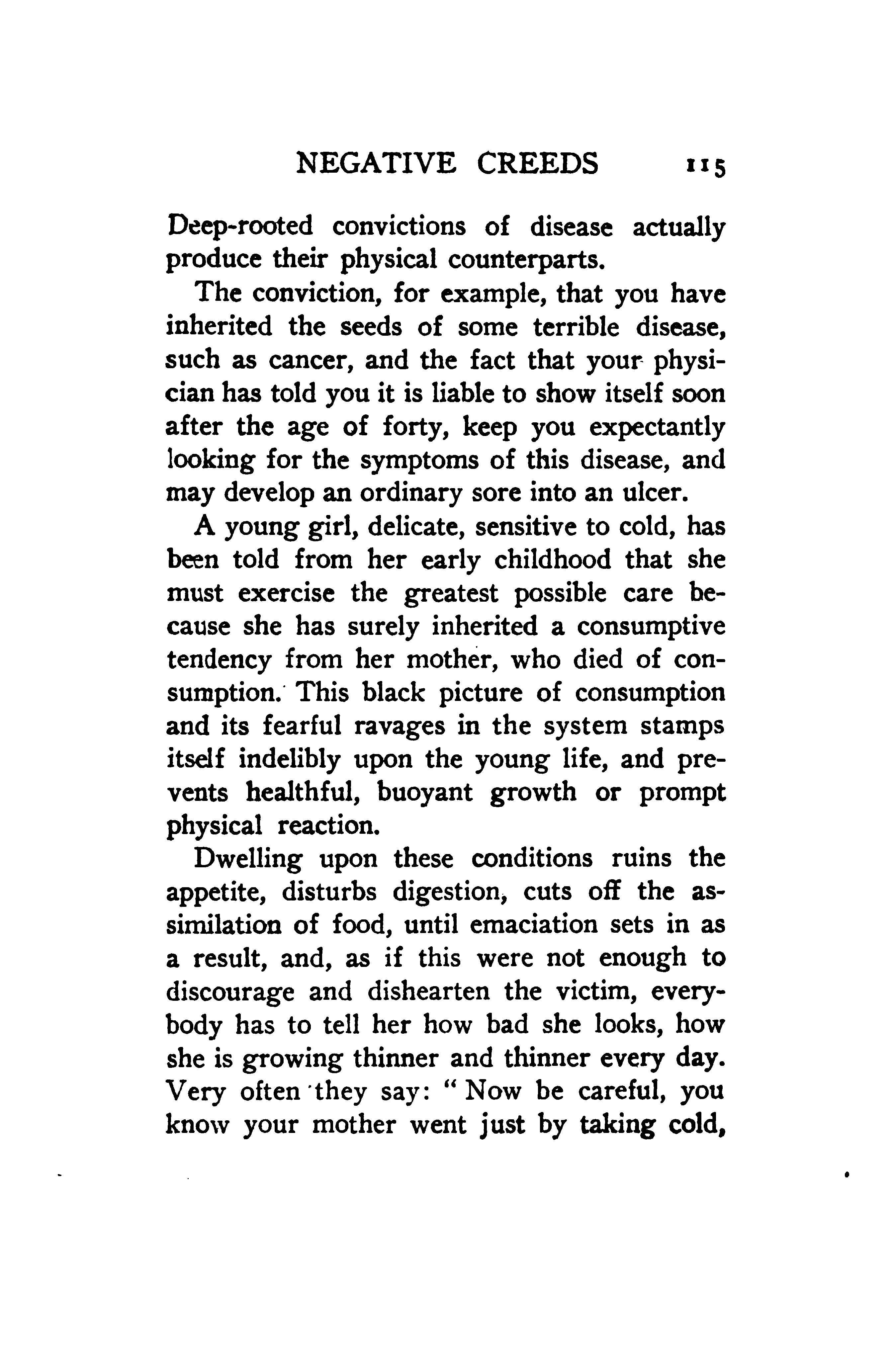 The conviction, for example, that you have inherited the seeds of some terrible disease, such as cancer, and the fact that your physician has told you it is liable to show itself soon after the age of forty, keep you expectantly looking for the symptoms of this disease, and may develop an ordinary sore into an ulcer.
