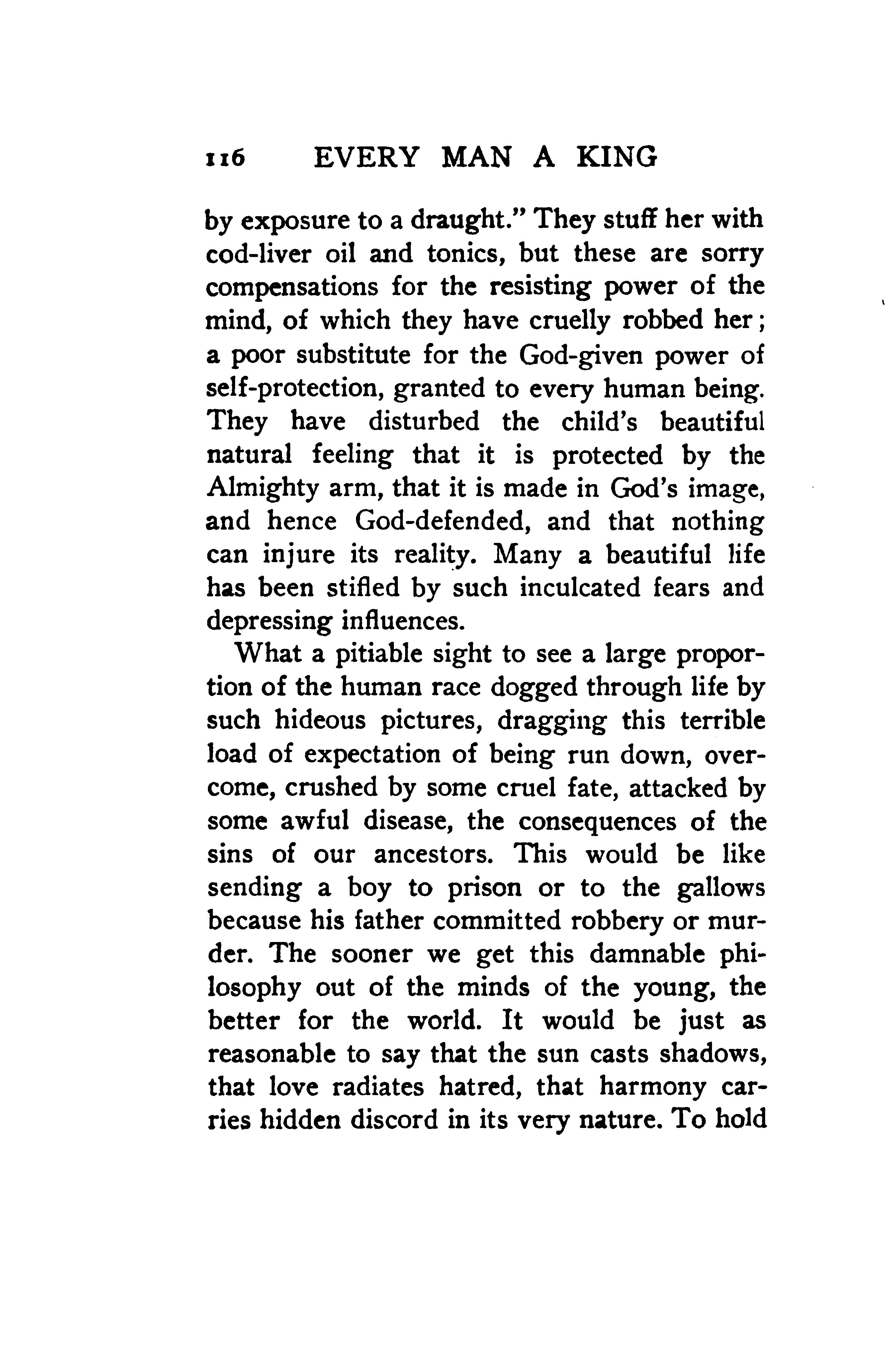 by exposure to a draught.” They stuff her with cod-liver oil and tonics, but these are sorry compensations for the resisting power of the mind, of which they have cruelly robbed her; a poor substitute for the God-given power of self-protection, granted to every human being. They have disturbed the child’s beautiful natural feeling that it is protected by the Almighty arm, that it is made in God’s image, and hence God-defended, and that nothing can injure its reality. Many a beautiful life has been stifled by such inculcated fears and depressing influences.