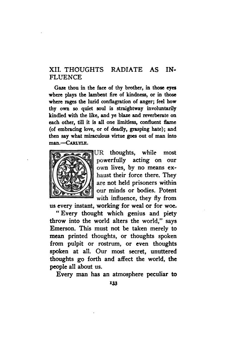 “Every thought which genius and piety throw into the world alters the world,” says Emerson. This must not be taken merely to mean printed thoughts, or thoughts spoken from pulpit or rostrum, or even thoughts spoken at all. Our most secret, unuttered thoughts go forth and affect the world, the people all about us.