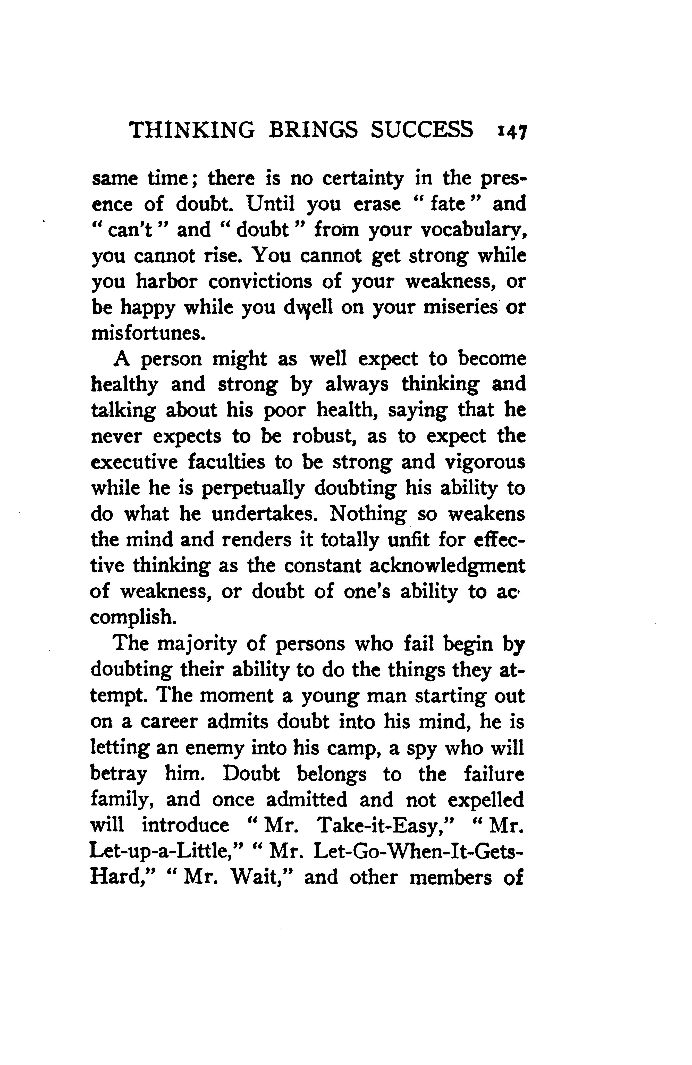 The majority of persons who fail begin by doubting their ability to do the things they attempt. The moment a young man starting out on a career admits doubt into his mind, he is letting an enemy into his camp, a spy who will betray him. Doubt belongs to the failure family, and once admitted and not expelled will introduce “Mr. Take-it-Easy”, “Mr. Let-up-a-Little”, “Mr. Let-Go-When-It-Gets Hard”, “Mr. Wait”, and other members of