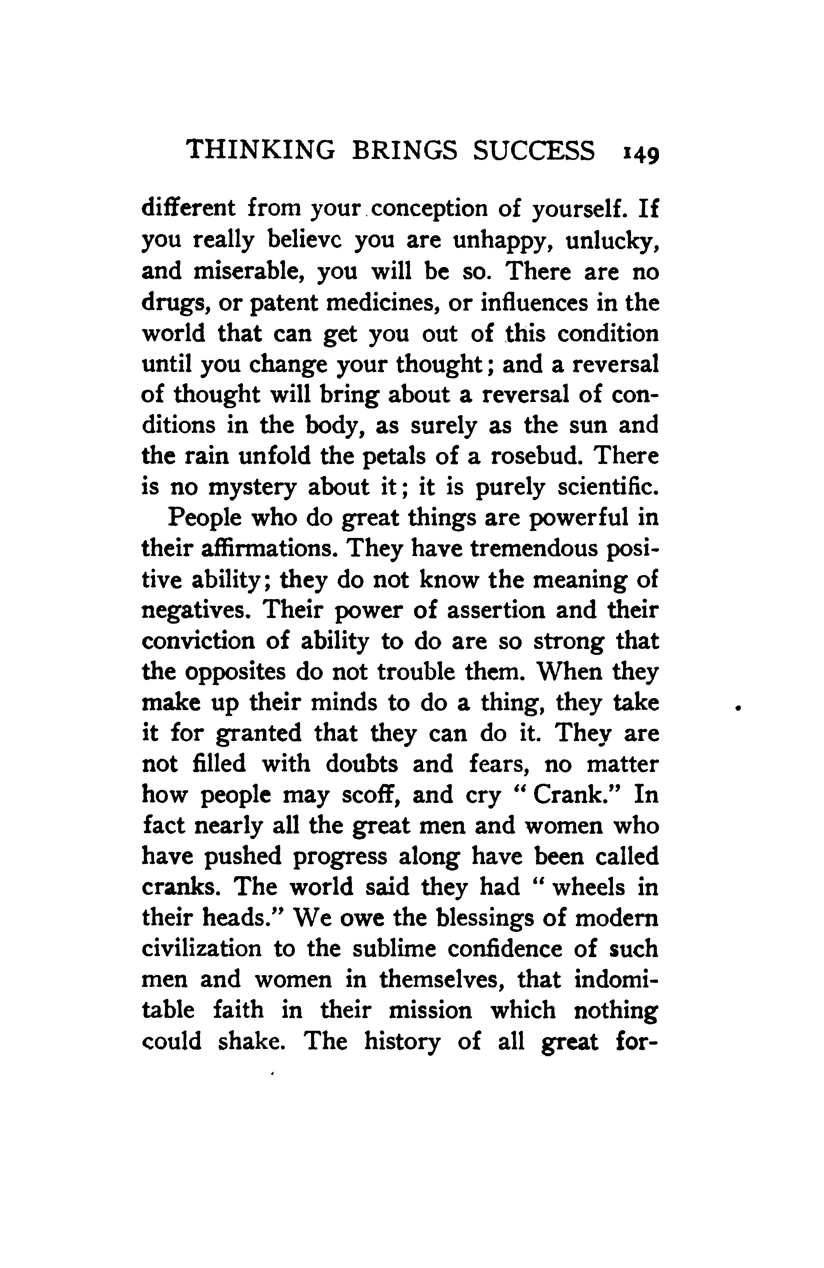 People who do great things are powerful in their affirmations. They have tremendous positive ability; they do not know the meaning of negatives. Their power of assertion and their conviction of ability to do are so strong that the opposites do not trouble them. When they make up their minds to do a thing, they take it for granted that they can do it. They are not filled with doubts and fears, no matter how people may scoff, and cry “Crank”. In fact nearly all the great men and women who have pushed progress along have been called cranks. The world said they had “wheels in their heads.” We owe the blessings of modern civilization to the sublime confidence of such men and women in themselves, that indomitable faith in their mission which nothing could shake. The history of all great forward