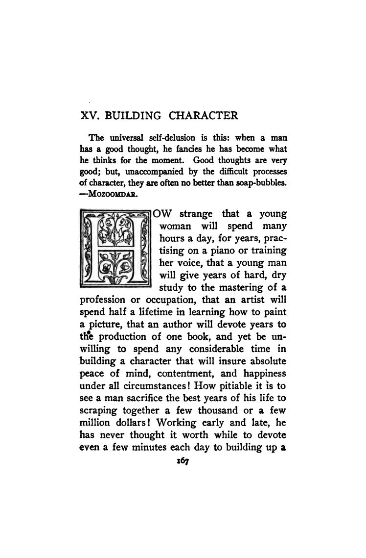How strange that a young woman will spend many hours a day, for years, practicing on a piano or training her voice, that a young man will give years of hard, dry study to the mastering of a profession or occupation, that an artist will spend half a lifetime in learning how to paint a picture, that an author will devote years to the production of one book, and yet be unwilling to spend any considerable time in building a character that will insure absolute peace of mind, contentment, and happiness under all circumstances! How pitiable it is to see a man sacrifice the best years of his life to scraping together a few thousand or a few million dollars! Working early and late, he has never thought it worthwhile to devote even a few minutes each day to building up a