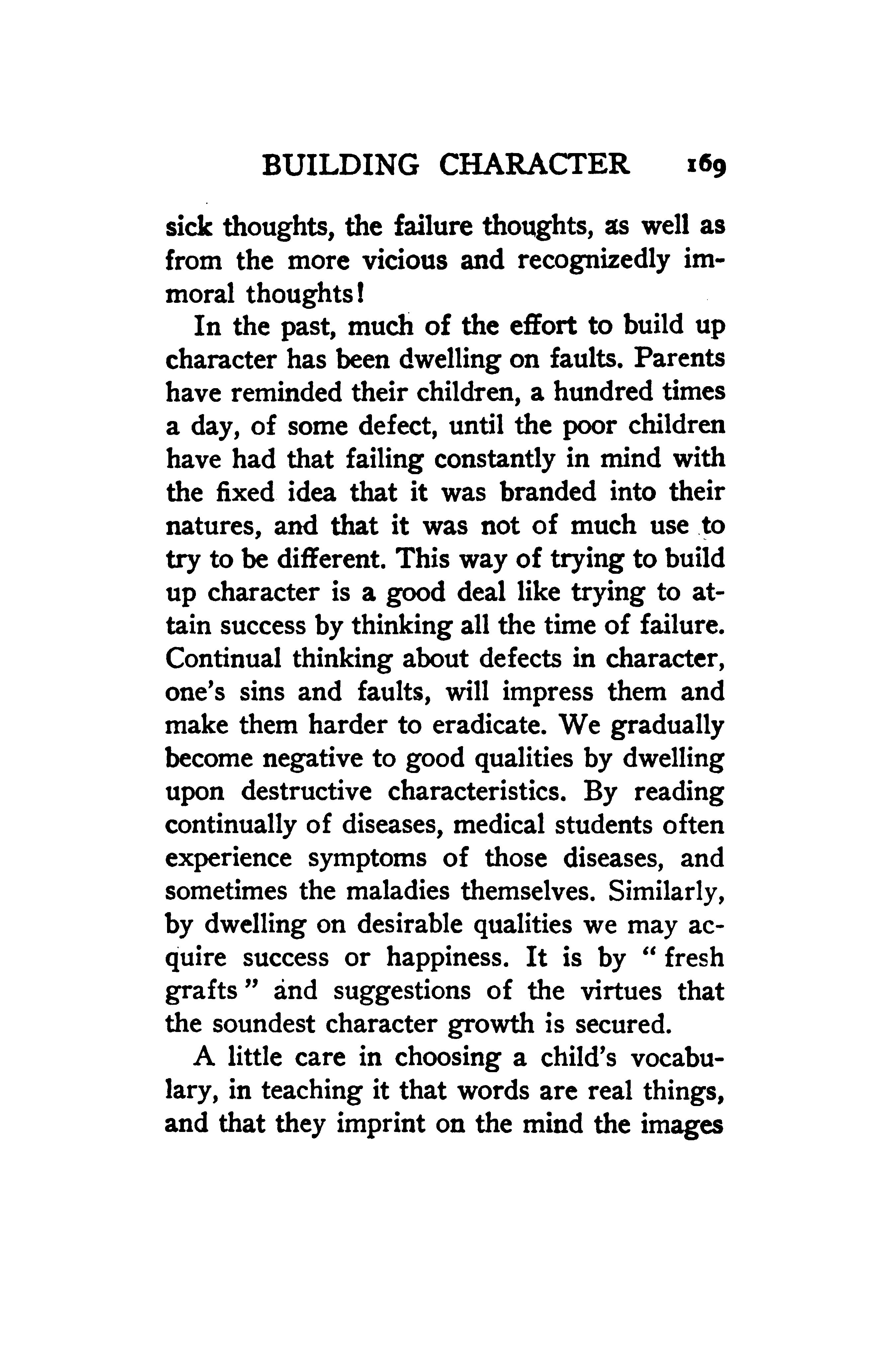 In the past, much of the effort to build up character has been dwelling on faults. Parents have reminded their children, a hundred times a day, of some defect, until the poor children have had that failing constantly in mind with the fixed idea that it was branded into their natures, and that it was not of much use to try to be different. This way of trying to build up character is a good deal like trying to attain success by thinking all the time of failure. Continual thinking about defects in character, one’s sins and faults, will impress them and make them harder to eradicate. We gradually become negative to good qualities by dwelling upon destructive characteristics. By reading continually of diseases, medical students often experience symptoms of those diseases, and sometimes the maladies themselves. Similarly, by dwelling on desirable qualities we may acquire success or happiness. It is by It fresh grafts and suggestions of the virtues that the soundest character growth is secured.