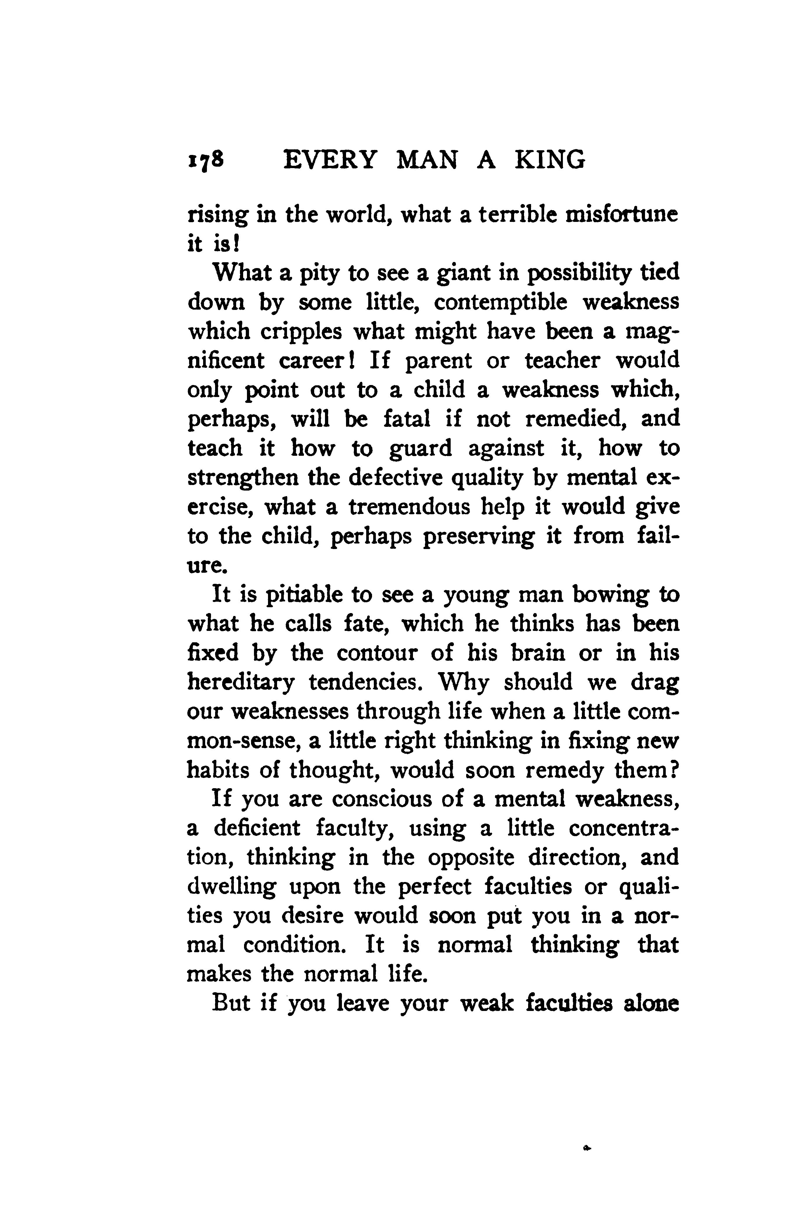 It is pitiable to see a young man bowing to what he calls fate, which he thinks has been fixed by the contour of his brain or in his hereditary tendencies. Why should we drag our weaknesses through life when a little common-sense, a little right thinking in fixing new habits of thought, would soon remedy them?
