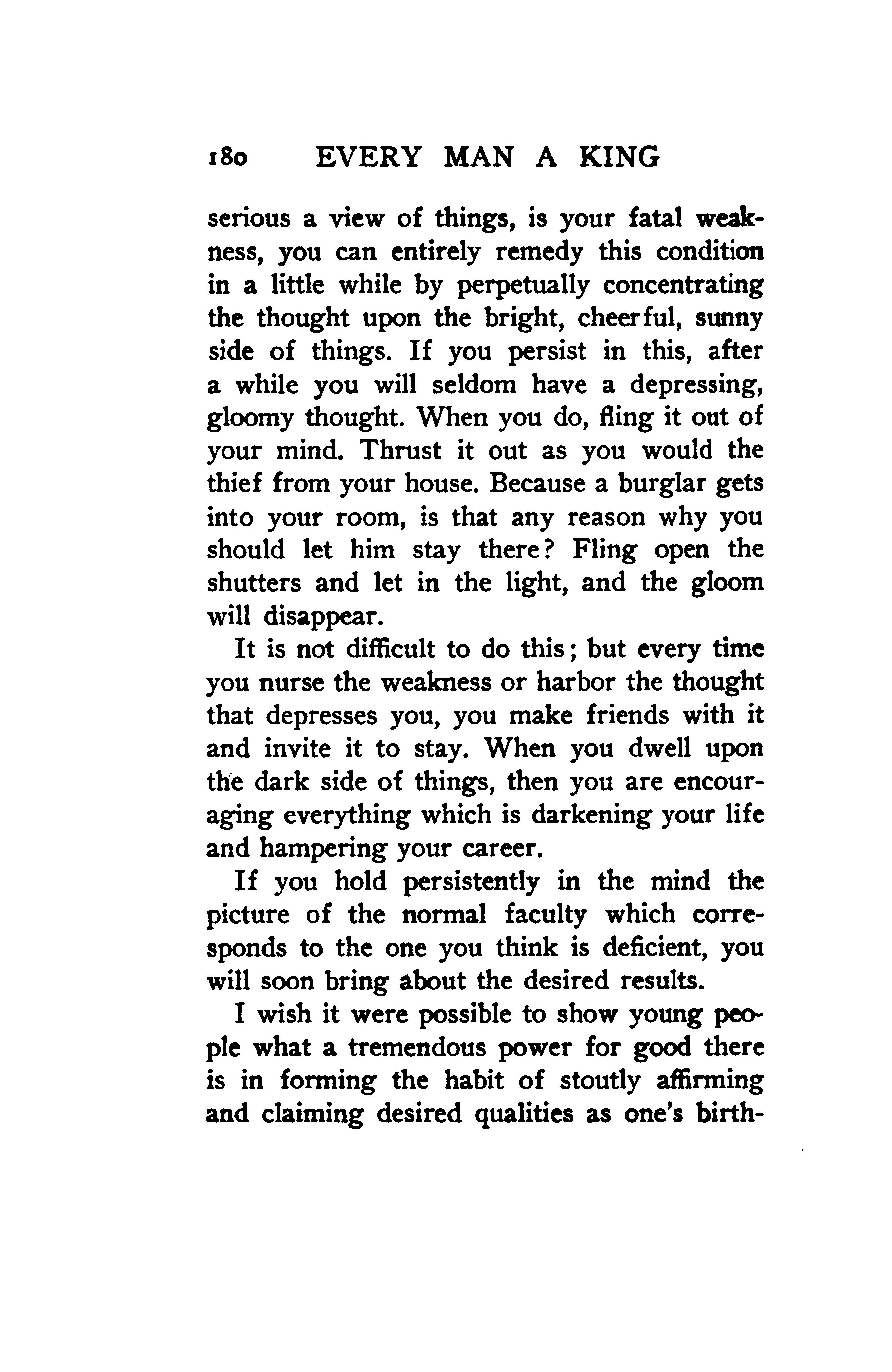 serious a view of things, is your fatal weakness, you can entirely remedy this condition in a little while by perpetually concentrating the thought upon the bright, cheerful, sunny side of things. If you persist in this, after a while you will seldom have a depressing, gloomy thought. When you do, fling it out of your mind. Thrust it out as you would the thief from your house. Because a burglar gets into your room, is that any reason why you should let him stay there? Fling open the shutters and let in the light, and the gloom will disappear.