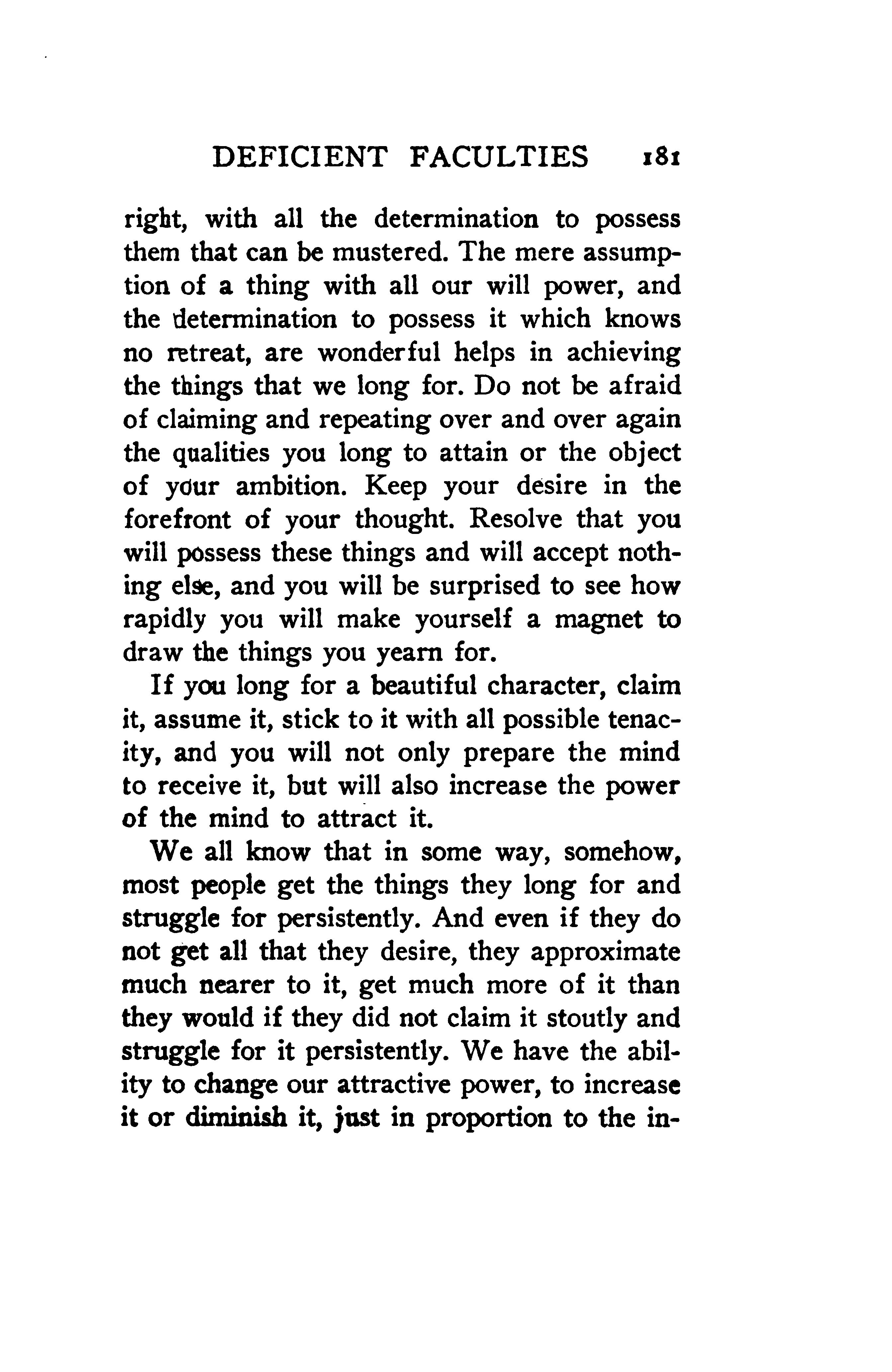 We all know that in some way, somehow, most people get the things they long for and struggle for persistently. And even if they do not get all that they desire, they approximate much nearer to it, get much more of it than they would if they did not claim it stoutly and struggle for it persistently. We have the ability to change our attractive power, to increase it or diminish it, just in proportion to the intensity