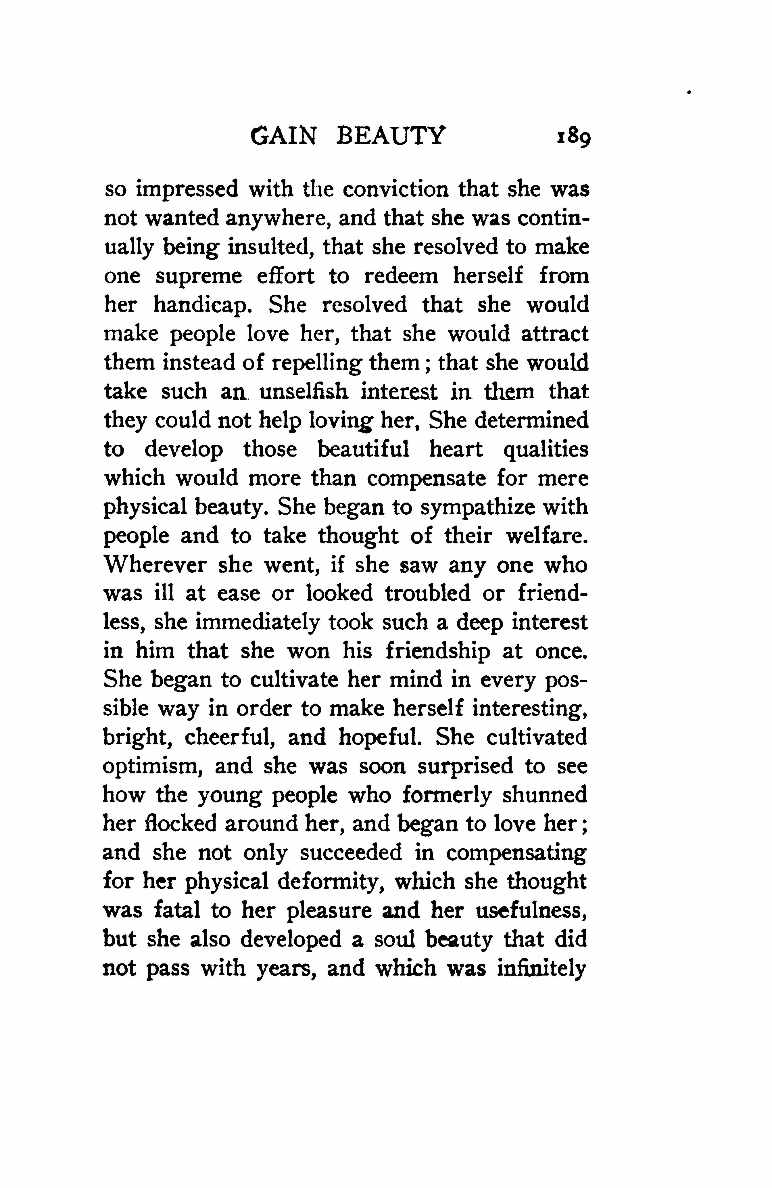 so impressed with the conviction that she was not wanted anywhere, and that she was continually being insulted, that she resolved to make one supreme effort to redeem herself from her handicap. She resolved that she would make people love her, that she would attract them instead of repelling them; that she would take such an unselfish interest in them that they could not help loving her. She determined to develop those beautiful heart qualities which would more than compensate for mere physical beauty. She began to sympathize with people and to take thought of their welfare. Wherever she went, if she saw anyone who was ill at ease or looked troubled or friendless, she immediately took such a deep interest in him that she won his friendship at once. She began to cultivate her mind in every possible way in order to make herself interesting, bright, cheerful, and hopeful. She cultivated optimism, and she was soon surprised to see how the young people who formerly shunned her flocked around her, and began to love her; and she not only succeeded in compensating for her physical deformity, which she thought was fatal to her pleasure and her usefulness, but she also developed a soul beauty that did not pass with years, and which was infinitely