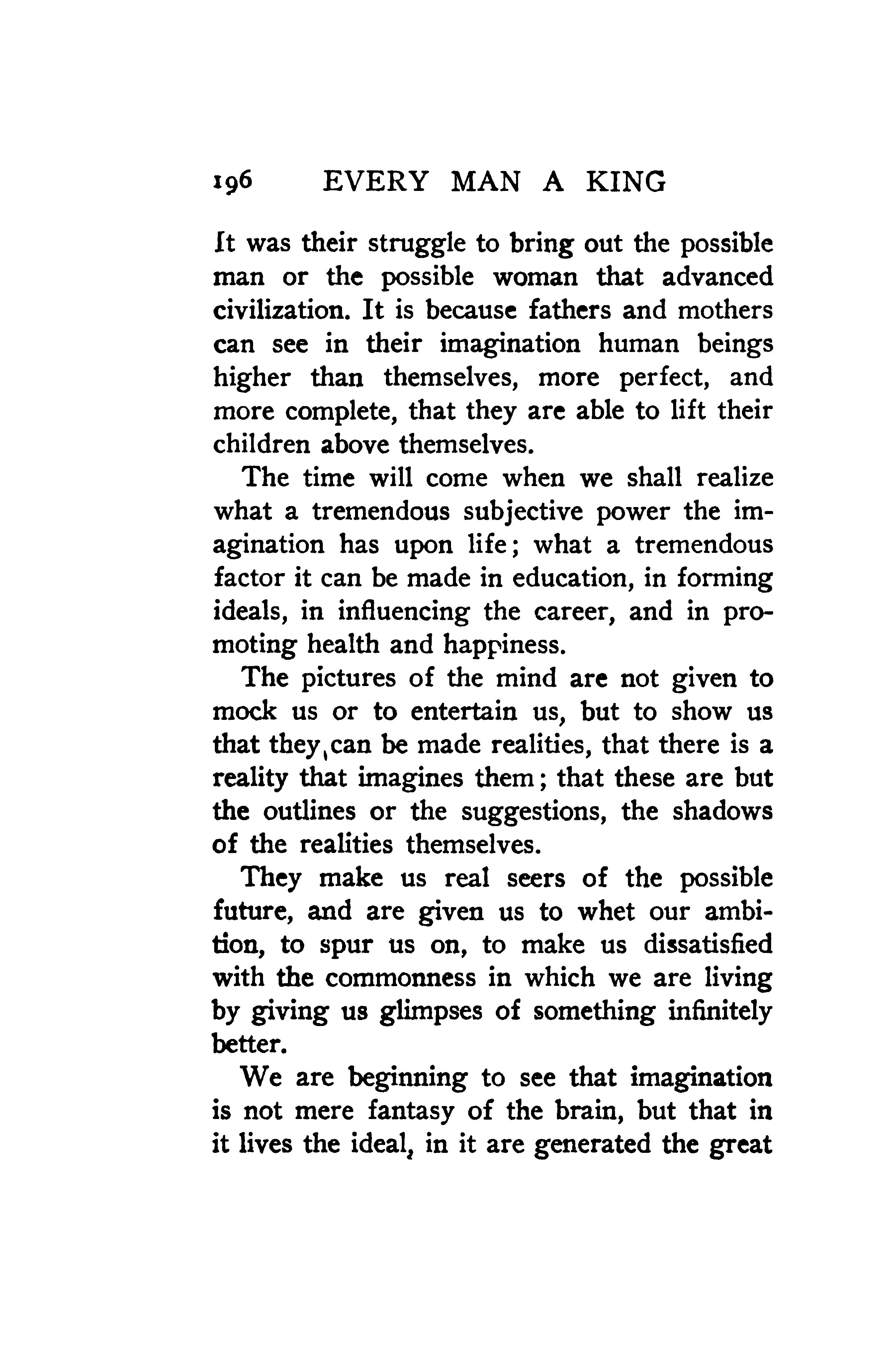 It was their struggle to bring out the possible man or the possible woman that advanced civilization. It is because fathers and mothers can see in their imagination human beings higher than themselves, more perfect, and more complete, that they are able to lift their children above themselves.