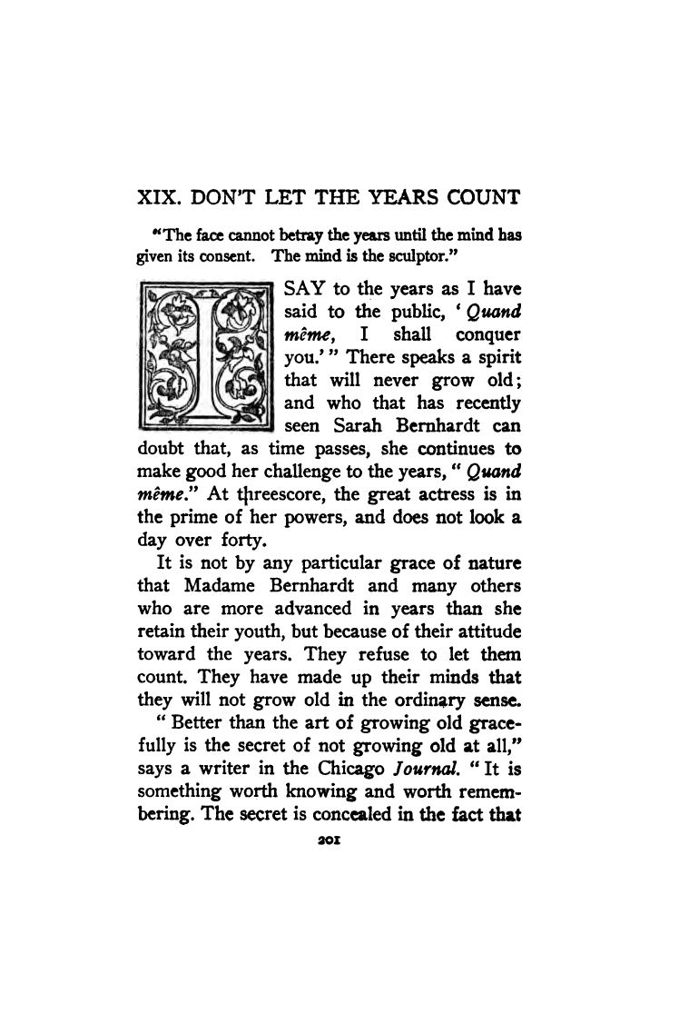 I SAY to the years as I have said to the public, “Quand meme, I shall conquer you.” There speaks a spirit that will never grow old; and who that has recently seen Sarah Bernhardt can doubt that, as time passes, she continues to make good her challenge to the years, “Quand meme”. At threescore, the great actress is in the prime of her powers, and does not look a day over forty. It is not by any particular grace of nature that Madame Bernhardt and many others who are more advanced in years than she retain their youth, but because of their attitude toward the years. They refuse to let them count. They have made up their minds that they will not grow old in the ordinary sense.