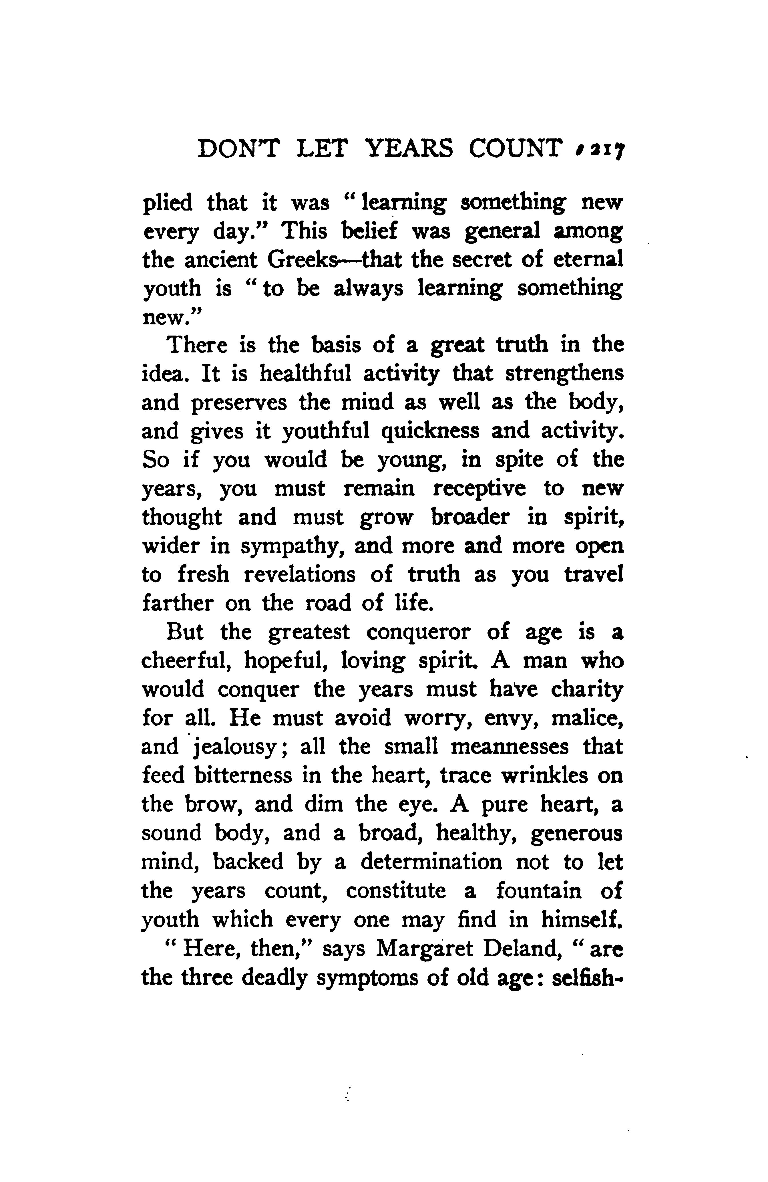 But the greatest conqueror of age is a cheerful, hopeful, loving spirit. A man who would conquer the years must have charity for all. He must avoid worry, envy, malice, and “jealousy; all the small meannesses that feed bitterness in the heart, trace wrinkles on the brow, and dim the eye. A pure heart, a sound body, and a broad, healthy, generous mind, backed by a determination not to let the years count, constitute a fountain of youth which everyone may find in himself.