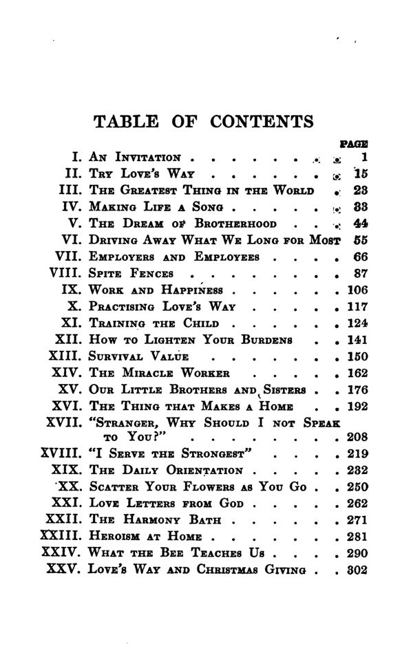An Invitation - Try Love's Way - The Greatest Thing in the World - Making Life a Song - The Dream of Brotherhood - Driving Away What We Long For Most - Employers and Employers - Spite Fences - Work and Happiness - Practising Love's Way - Training the Child - How to Lighten Your Words - Survival Value - The Miracle Worker - Our Little Brothers and Sisters - The Thing That Makes a Home - "Stranger, Why Should I NOT Speak to you?" - "I Serve the Strongest" - The Daily Orientation - Scatter Your Flowers As You Go - Love Letters From God - The Harmony Bath - Heroism at Home - What the Bee Teaches Us - Love's Way and Christmas Giving - Contents -