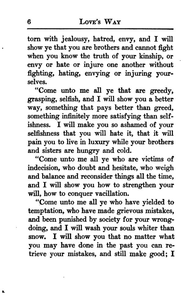 "Come unto me all ye that are greedy, grasping, selfish, and I will show you a better way, something that pays better than greed, something infinitely more satisfying than selfishness. I will make you so ashamed of your selfishness that you will hate it, that it will pain you to live in luxury while your brothers and sisters are hungry and cold.