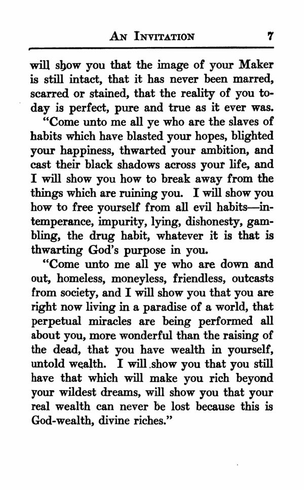 "Come unto me all ye who are down and out, homeless, moneyless, friendless, outcasts from society, and I will show you that you are right now living in a paradise of a world, that perpetual miracles are being performed all about you, more wonderful than the raising of the dead, that you have wealth in yourself, untold wealth. I will show you that you still have that which will make you rich beyond your wildest dreams, will show you that your real wealth can never be lost because this is God-wealth, divine riches."