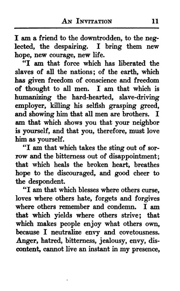 "I am that force which has liberated the slaves of all the nations; of the earth, which has given freedom of conscience and freedom of thought to all men. I am that which is humanizing the hard-hearted, slave-driving employer, killing his selfish grasping greed, and showing him that all men are brothers. I am that which shows you that your neighbor is yourself, and that you, therefore, must love him as yourself.