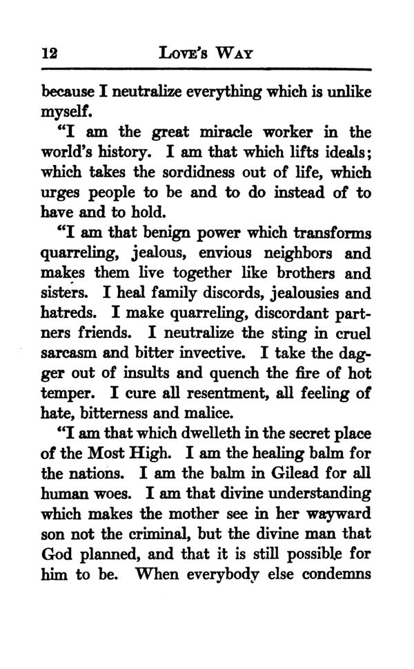 "I am that benign power which transforms quarreling, jealous, envious neighbors and makes them live together like brothers and sisters. I heal family discords, jealousies and hatreds. I make quarreling, discordant partners friends. I neutralize the sting in cruel sarcasm and bitter invective. I take the dagger out of insults and quench the fire of hot temper. I cure all resentment, all feeling of hate, bitterness and malice.
