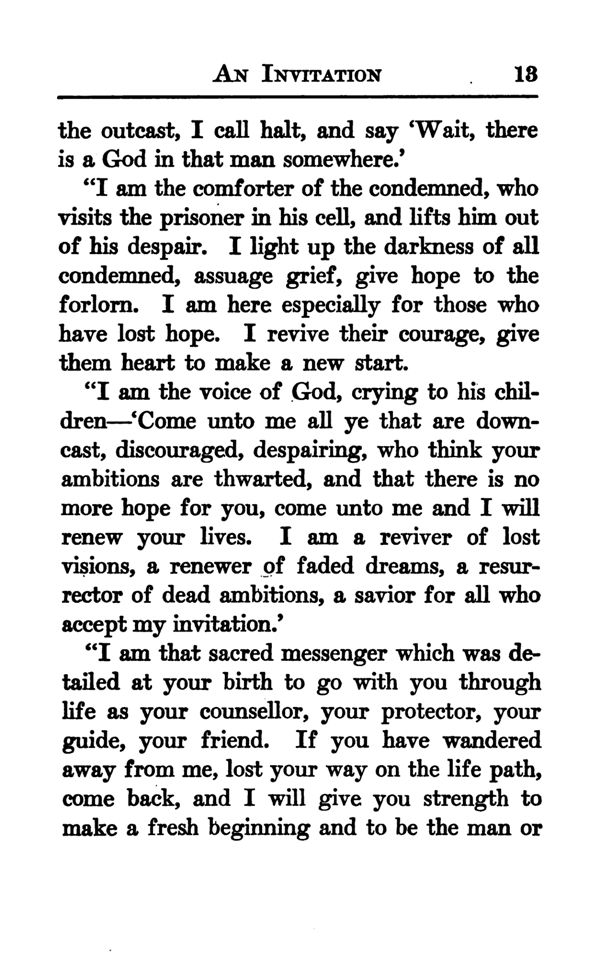 "I am that sacred messenger which was detailed at your birth to go with you through life as your counsellor, your protector, your guide, your friend. If you have wandered away from me, lost your way on the life path, come back, and I will give you strength to make a fresh beginning and to be the man or