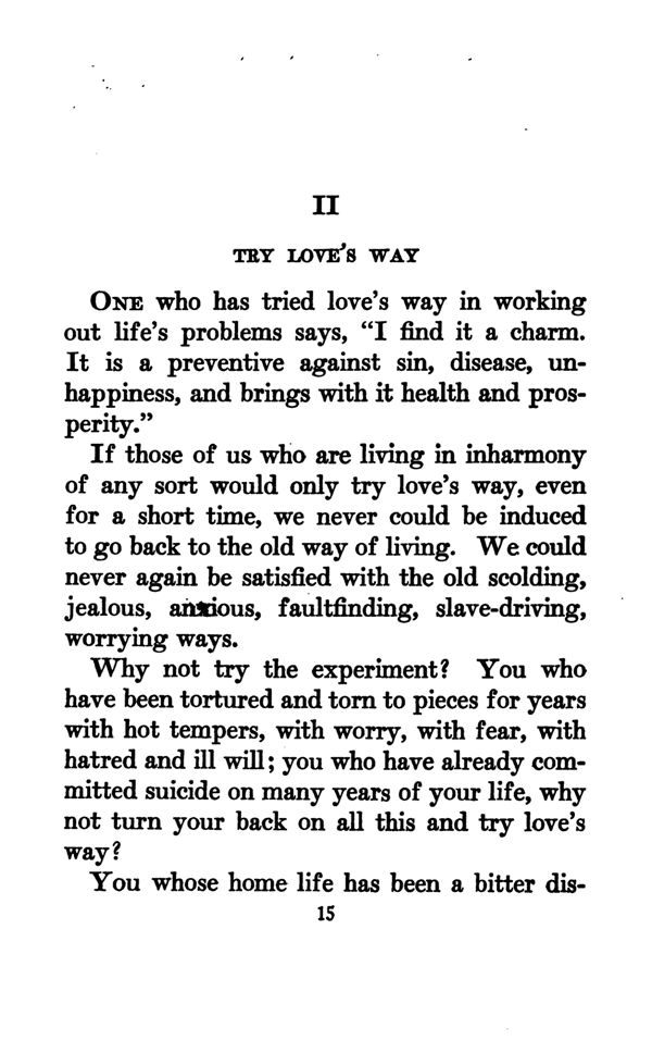 If those of us who are living in harmony of any sort would only try love's way, even for a short time, we never could be induced to go back to the old way of living. We could never again be satisfied with the old scolding, jealous, anxious, faultfinding, slave-driving, worrying ways.