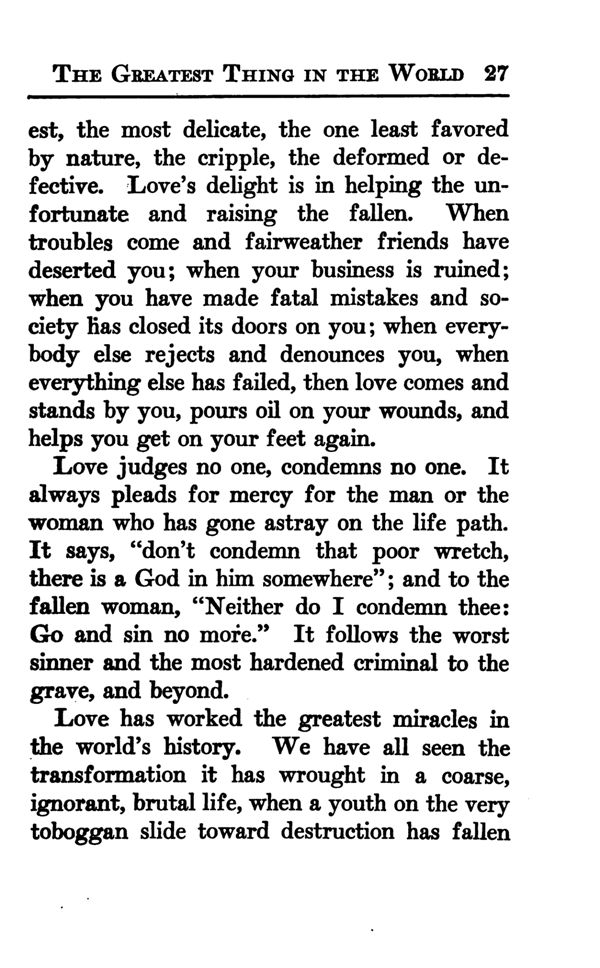 the most delicate, the one least favored by nature, the cripple, the deformed or defective. Love's delight is in helping the unfortunate and raising the fallen. When troubles come and fairweather friends have deserted you; when your business is mined; when you have made fatal mistakes and society has closed its doors on you; when every body else rejects and denounces you, when everything else has failed, then love comes and stands by you, pours oil on your wounds, and helps you get on your feet again.