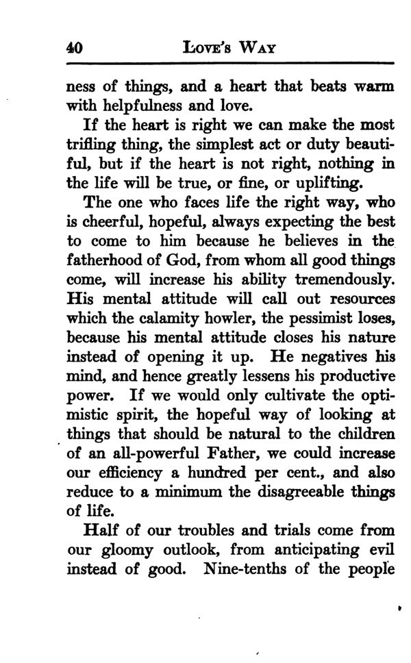 The one who faces life the right way, who is cheerful, hopeful, always expecting the best to come to him because he believes in the fatherhood of God, from whom all good things come, will increase his ability tremendously. His mental attitude will call out resources which the calamity howler, the pessimist loses, because his mental attitude closes his nature instead of opening it up. He negatives his mind, and hence greatly lessens his productive power. If we would only cultivate the optimistic spirit, the hopeful way of looking at things that should be natural to the children of an all-powerful Father, we could increase our efficiency a hundred per cent., and also reduce to a minimum the disagreeable things of life.