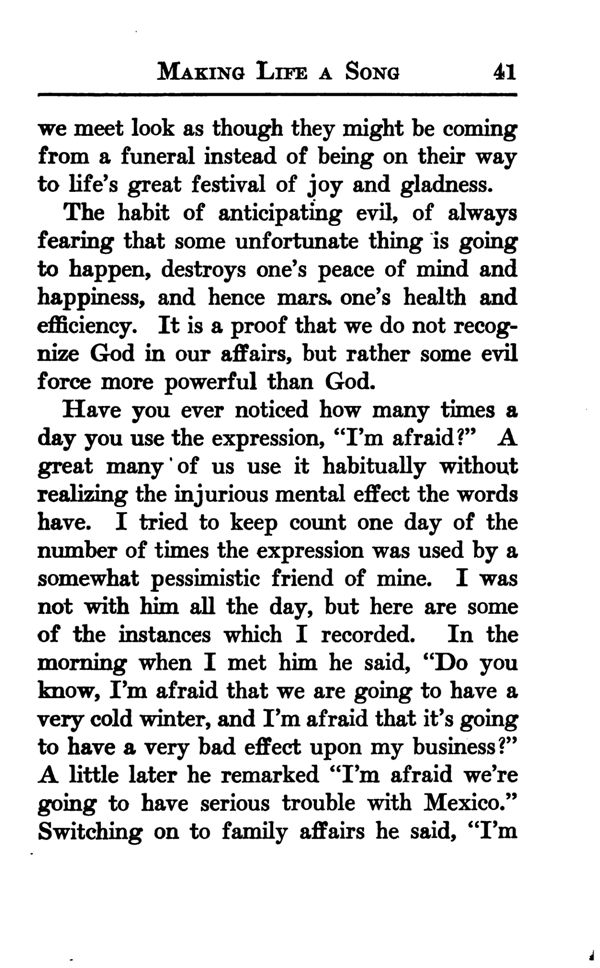 Have you ever noticed how many times a day you use the expression, "I'm afraid?" A great many ' of us use it habitually without realizing the injurious mental effect the words have. I tried to keep count one day of the number of times the expression was used by a somewhat pessimistic friend of mine. I was not with him all the day, but here are some of the instances which I recorded. In the morning when I met him he said, "Do you know, I'm afraid that we are going to have a very cold winter, and I'm afraid that it's going to have a very bad effect upon my business?"