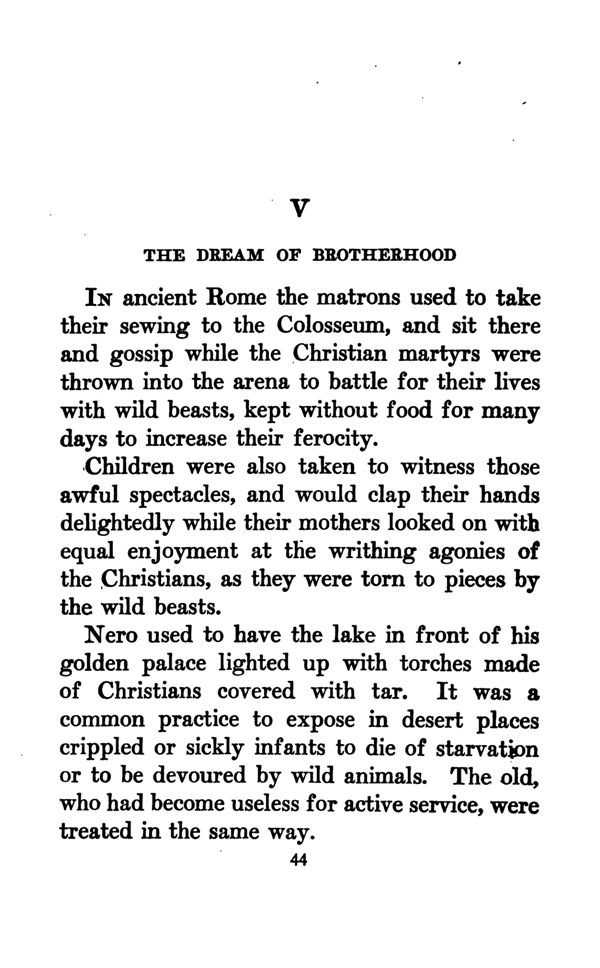 IN ancient Rome the matrons used to take their sewing to the Colosseum, and sit there and gossip while the Christian martyrs were thrown into the arena to battle for their lives with wild beasts, kept without food for many days to increase their ferocity.